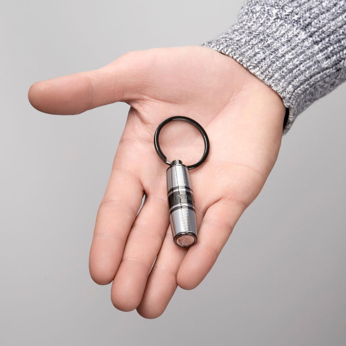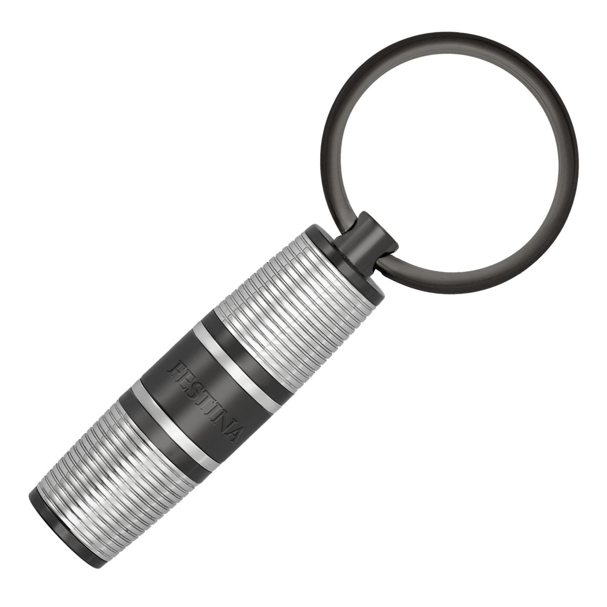 Accessoire porte-clés de la marque Festina. Corps en métal gravé à fines rayures, orné d'un blason complexe à l'extrémité, témoigne d'un travail artisanal méticuleux et d'un design intemporel.