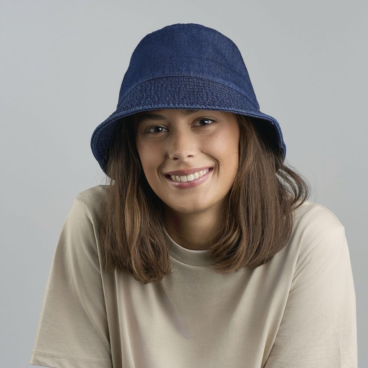 Bob en denim - Denim classique avec un tissage en diagonale. Coton recyclé, à impact environnemental réduit. Tour de tête souple pour un confort amélioré. La teinture DyStar® contribue à réduire l’utilisation de produits chimiques et de polluants.