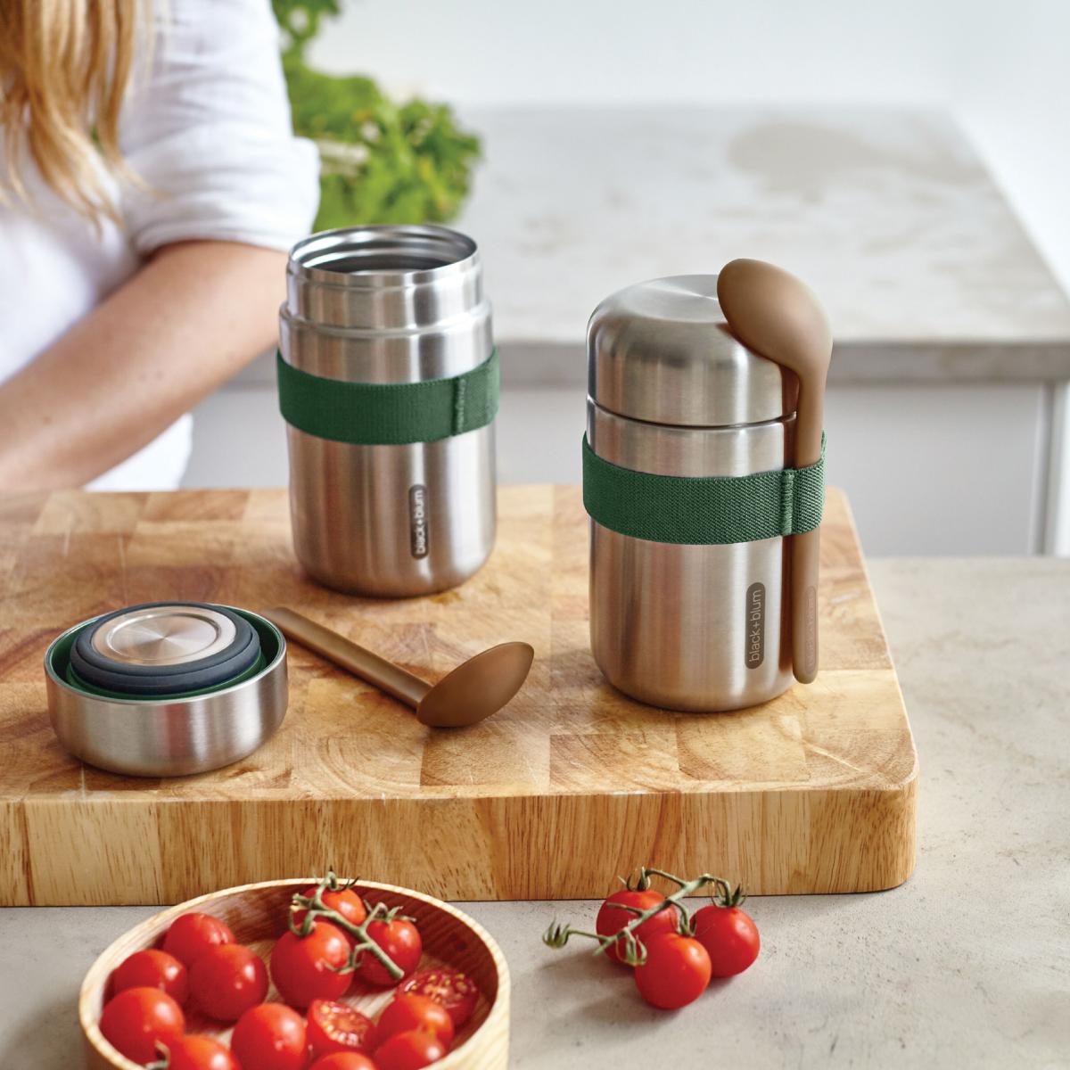 Bocal/Lunch box en acier inoxydable. Cuillère en fibres de bois provenant de sources durables. Bocal scellé sous vide pour garder les aliments chauds jusqu'à 6 heures et froids jusqu'à 8 heures. Emballé dans un coffret cadeau.