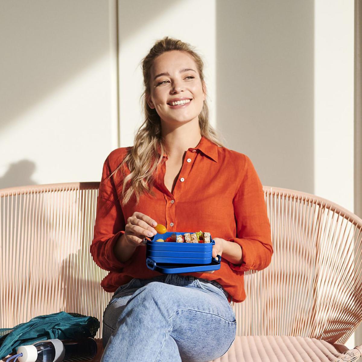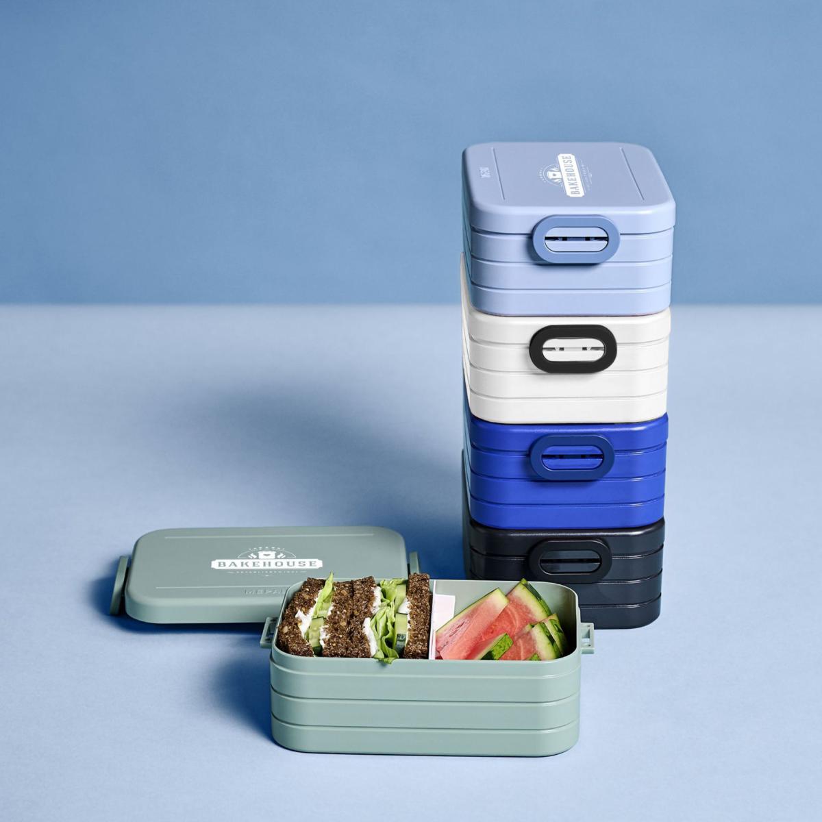 Boîte à déjeuner de la marque MEPAL avec deux compartiments séparés et une boîte supplémentaire avec une fourchette. Couvercle bien ajusté et équipé d'une bague d'étanchéité. Les bentos de la boîte à déjeuner peuvent être réchauffés au micro-ondes, sans couvercle. Produit de très haute qualité.