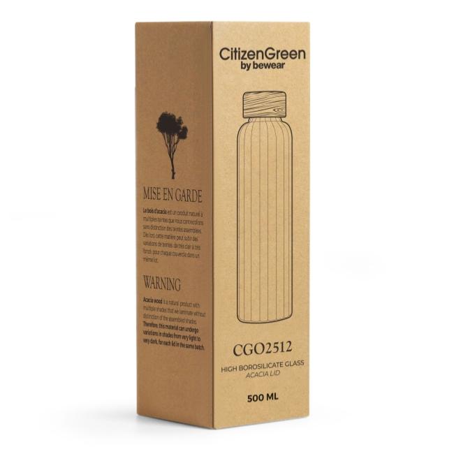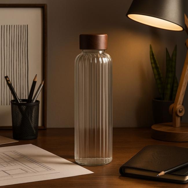 Bouteille en verre borosilicate 550ml. Stries intérieur, extérieur lisse. Bouchon en bois d'acacia et PP muni d'un joint silicone. Dimensions : Ø6,5 x 24cm.
