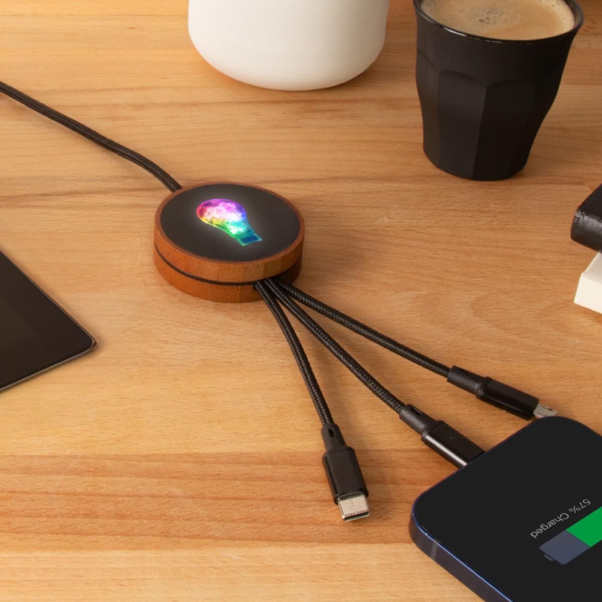 Câble 5-en-1, avec un entrée USB-A et USB type-C, équipé de 4 types de sorties (Type-C, Micro USB, iPhone & induction 10W). Logo lumineux. Possibilité de charger plusieurs appareils en même temps. Câble constitué de matériaux écologiques (bambou et cordons en RPET). Pochette en TPE recyclable et cartonnette en papier kraft.