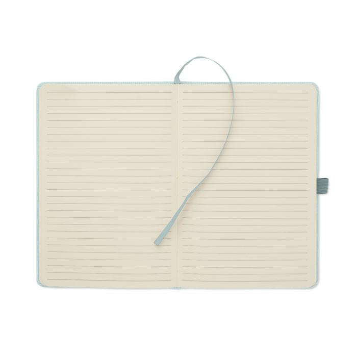 Carnet A5 avec couverture rigide en velours côtelé de polyester RPET (recyclé). Contient 192 pages lignées en papier recyclé (70 gr/m2). Reliure élastique, passant stylo, marque-page et étiquette en papier kraft.