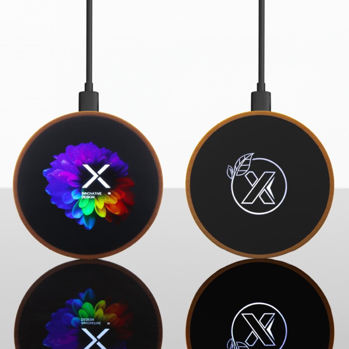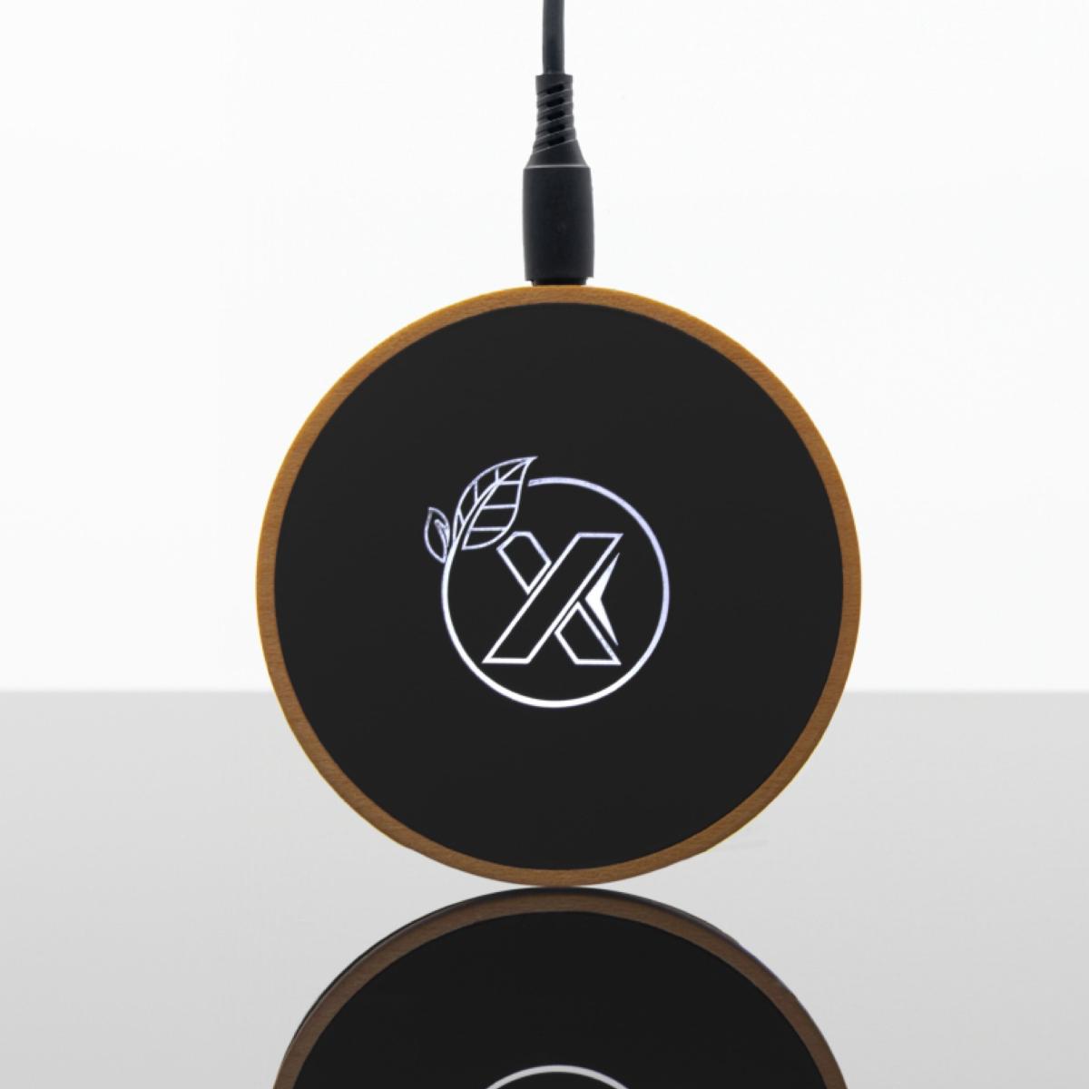 Chargeur à induction sans fil 10W. Logo lumineux. Câble de chargement en RPET inclus. Boîte cadeau en papier recyclé avec fermeture aimantée.