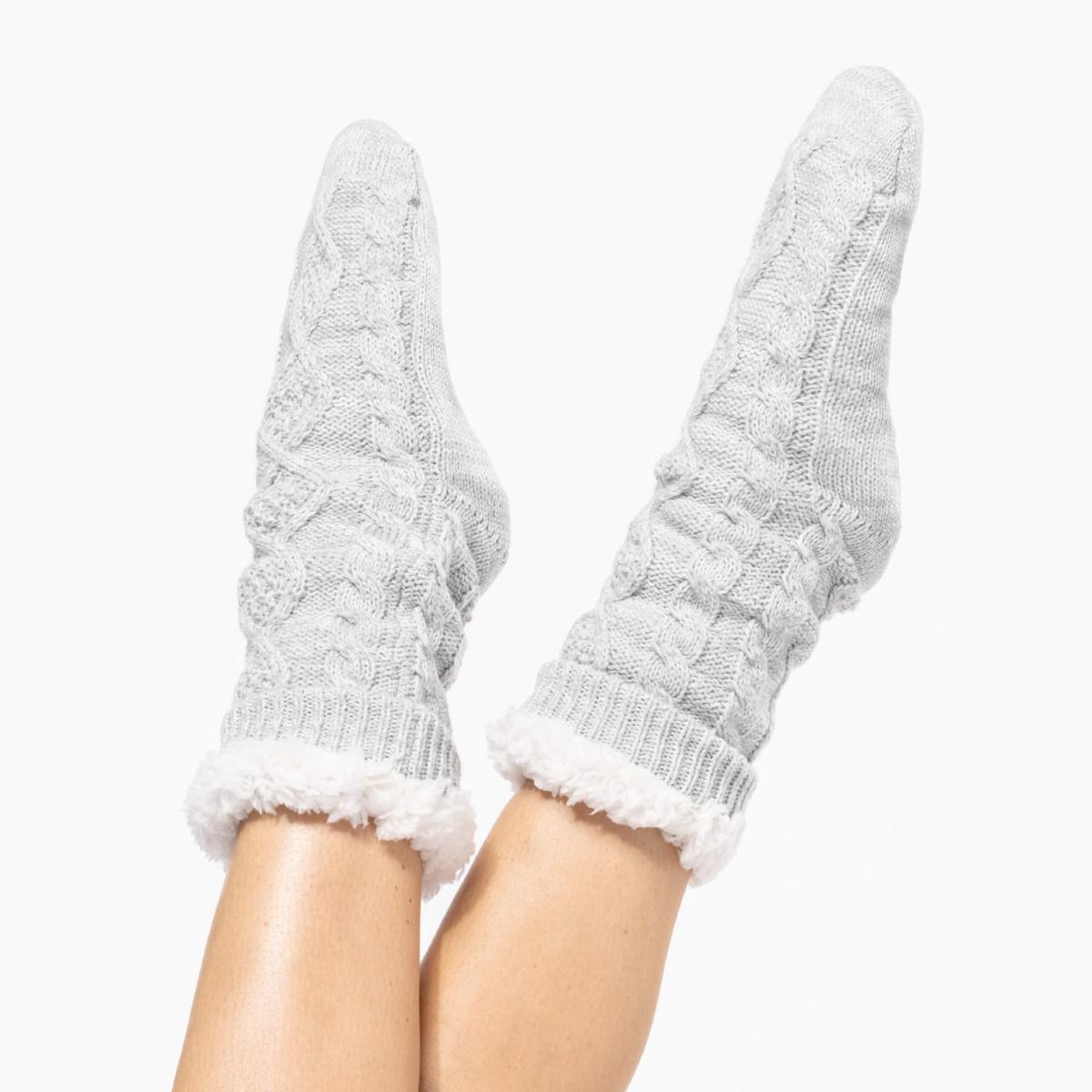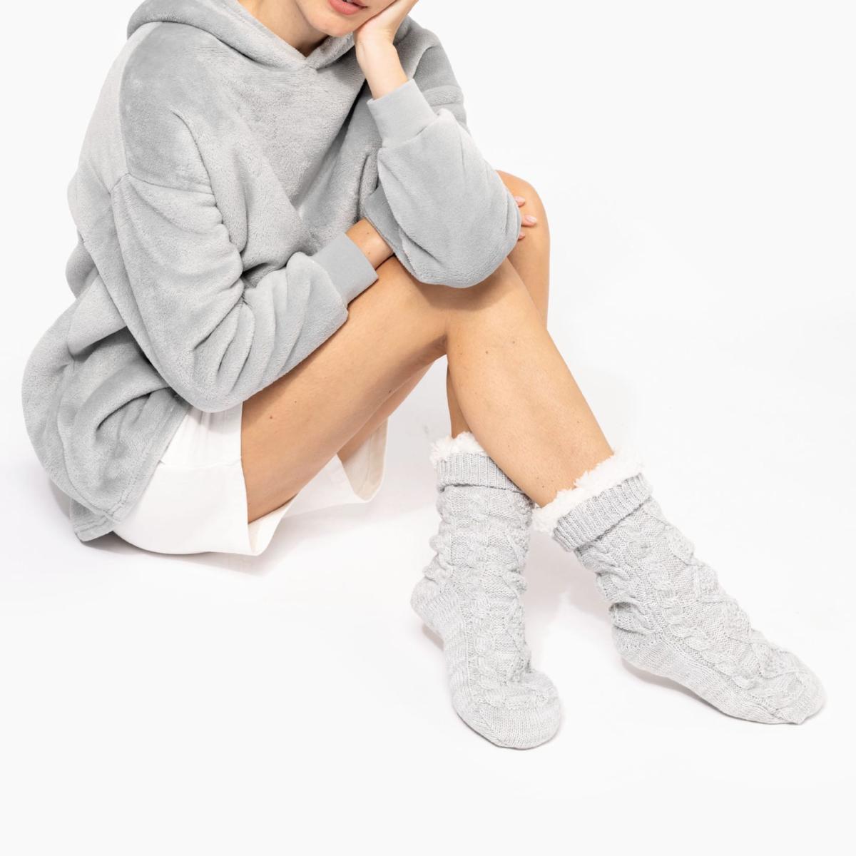 Chaussettes lounge doublées sherpa. Effet tricoté main avec maille torsadée. La paire cosy idéale à porter en intérieur. Antidérapantes. Confort optimal et maintien de la chaleur grâce à la doublure en sherpa.