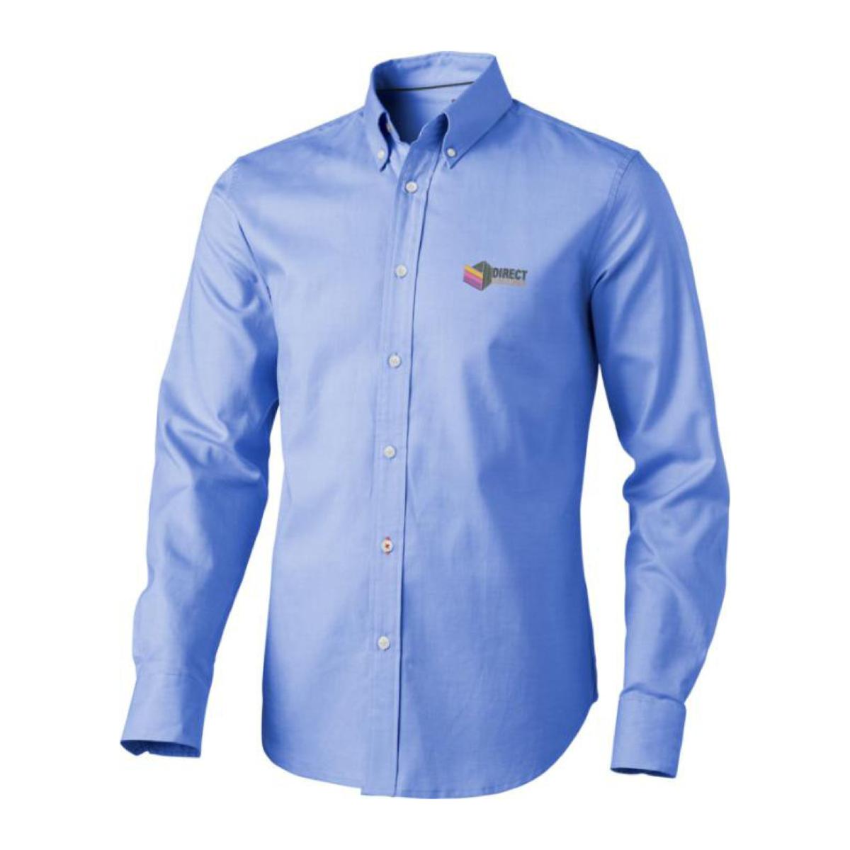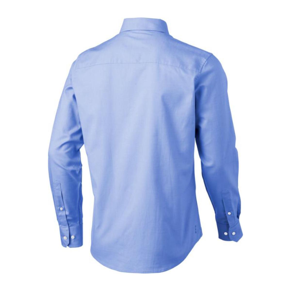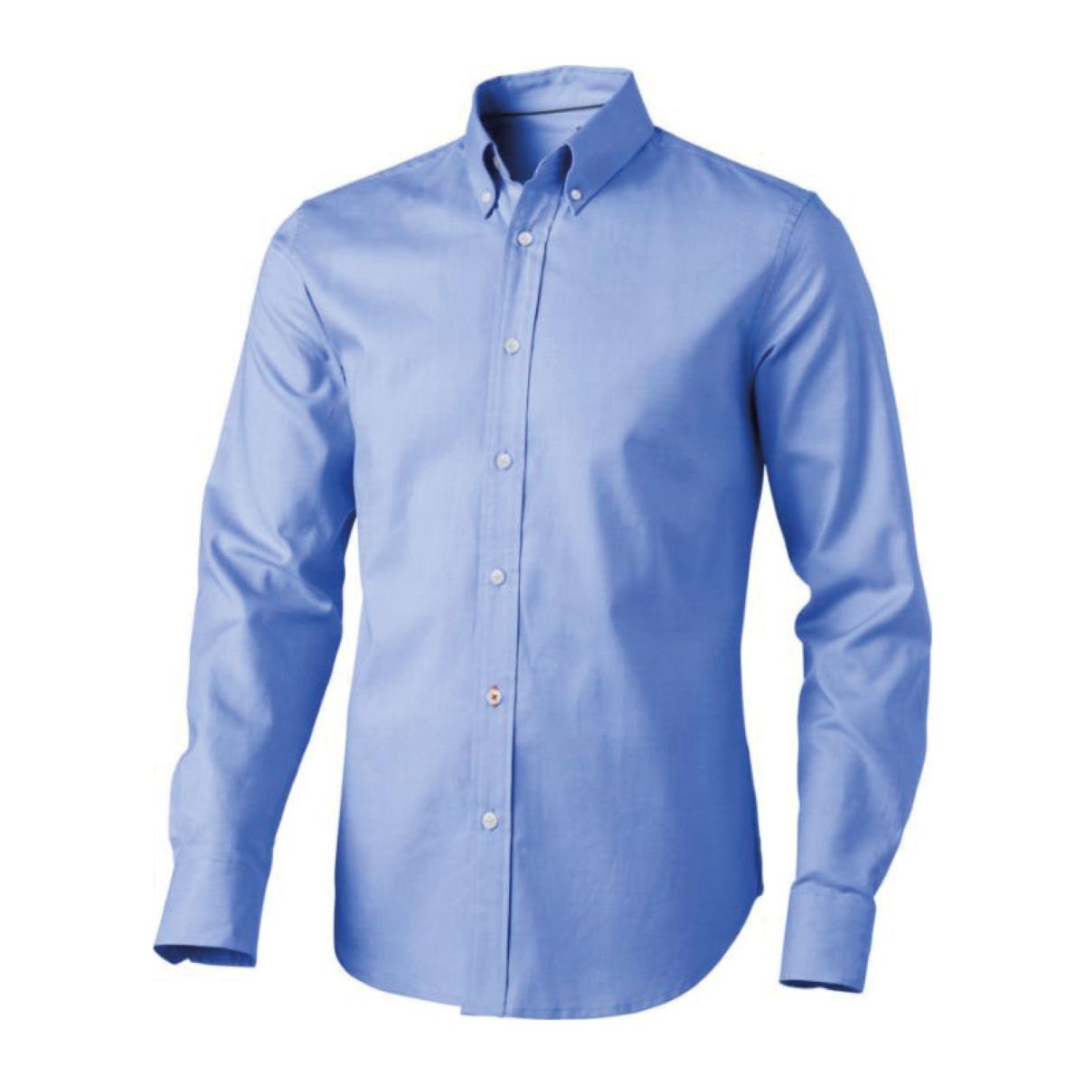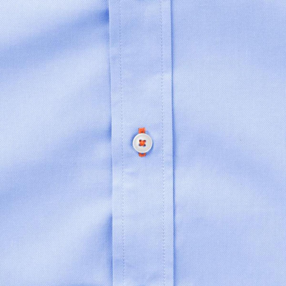 Chemise à manches longues pour homme en coton de haute qualité. Texture raffinée. Col boutonné. Deuxième boutonnière en partant du bas ornée d'une surpiqûre orange.