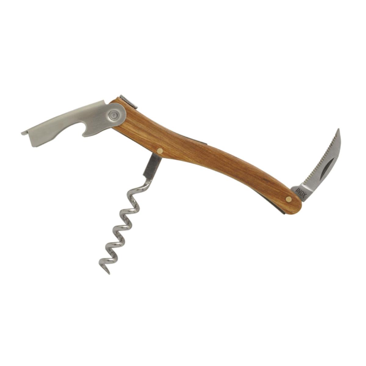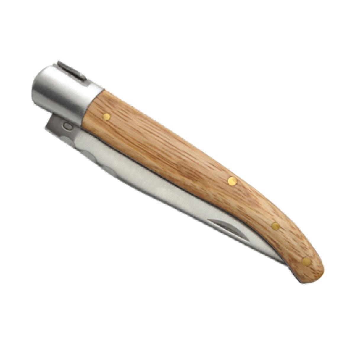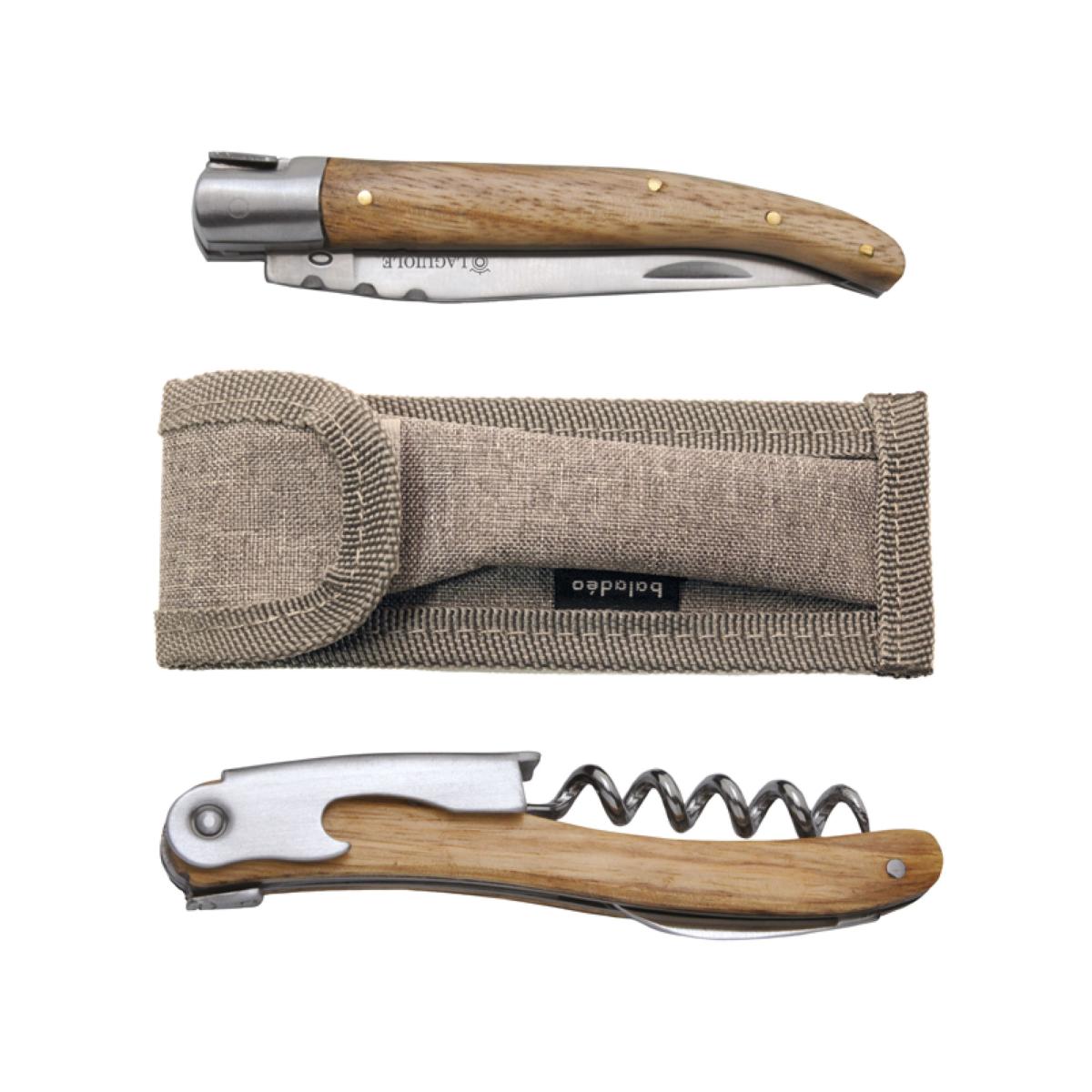 Coffret duo composé d'un couteau pliant 11 cm et d'un sommelier. Manches en frêne exotique. Couteau avec lame en acier inoxydable 420. Ressort guilloché. Mitre forgée en acier inoxydable. Tire-bouchon professionnel avec mèche cinq spirales en acier inoxydable, lame coupe-collerette micro-dentée et décapsuleur. Livrés avec un étui de ceinture en nylon 420D gris chiné dans un coffret cadeau en carton noir.
