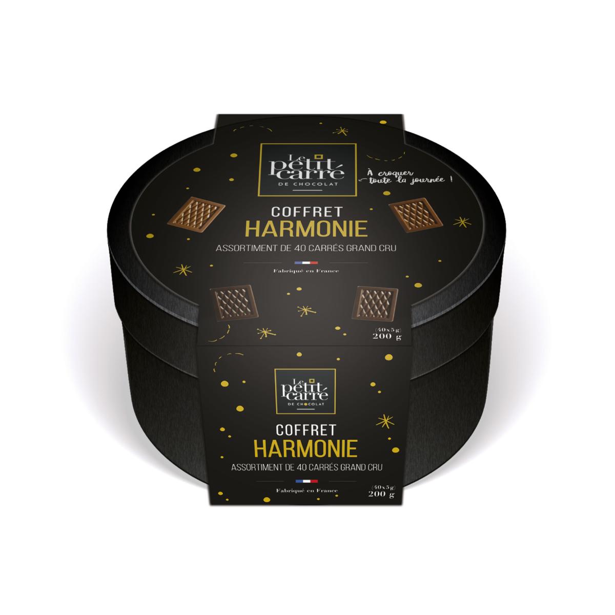 Coffret gourmand personnalisé, 40 carrés dégustation de 5g - Le Petit Carré de Chocolat. Assortiment des 4 saveurs 42% lait, Gianduja, 68% Mexique, 75% Tanzanie. Poids net : 200 g. Dimensions coffret : 125 x 65 mm.