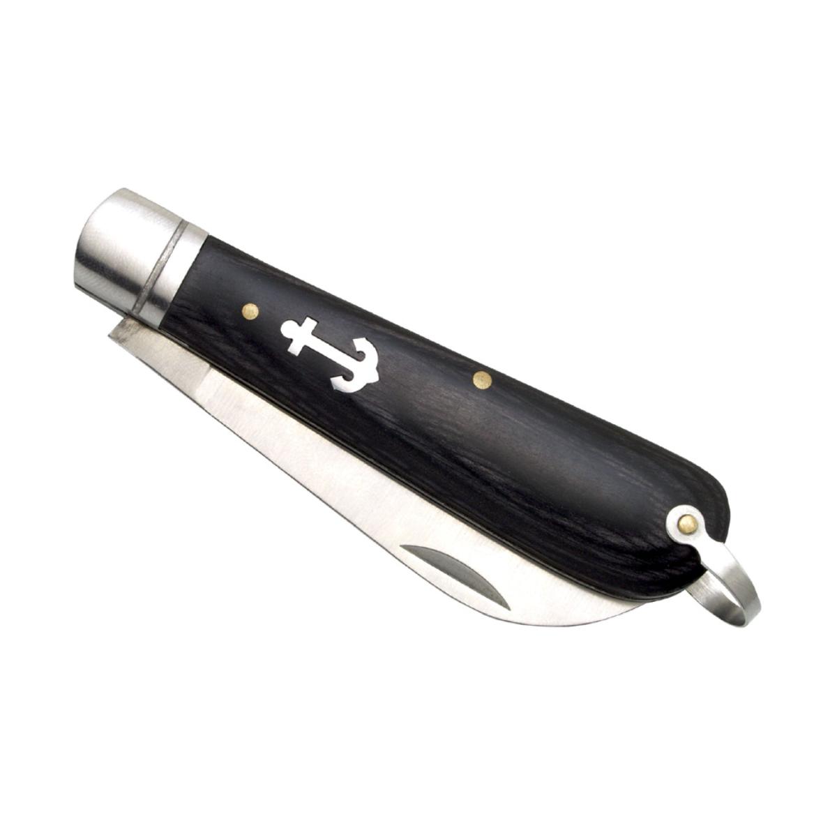Couteau pliant avec lame en acier inoxydable 420. Lame résistante à l'oxydation. Système de blocage de lame avec cran forcé. Manche en bois massif de couleur noire incrusté d'une ancre marine. Belière en acier inoxydable. Livré dans un étui gris chiné en RPET (polyester recyclé).