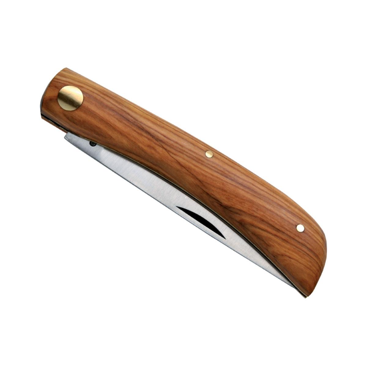 Couteau pliant avec lame en acier inoxydable 420. Lame résistante à l'oxydation. Fermeture du couteau par cran forcé. Manche en bois d'olivier pour apporter élégance et authenticité. Manche arrondi et épaissi pour une meilleure prise en main. Livré dans un étui gris chiné en RPET (polyester recyclé).