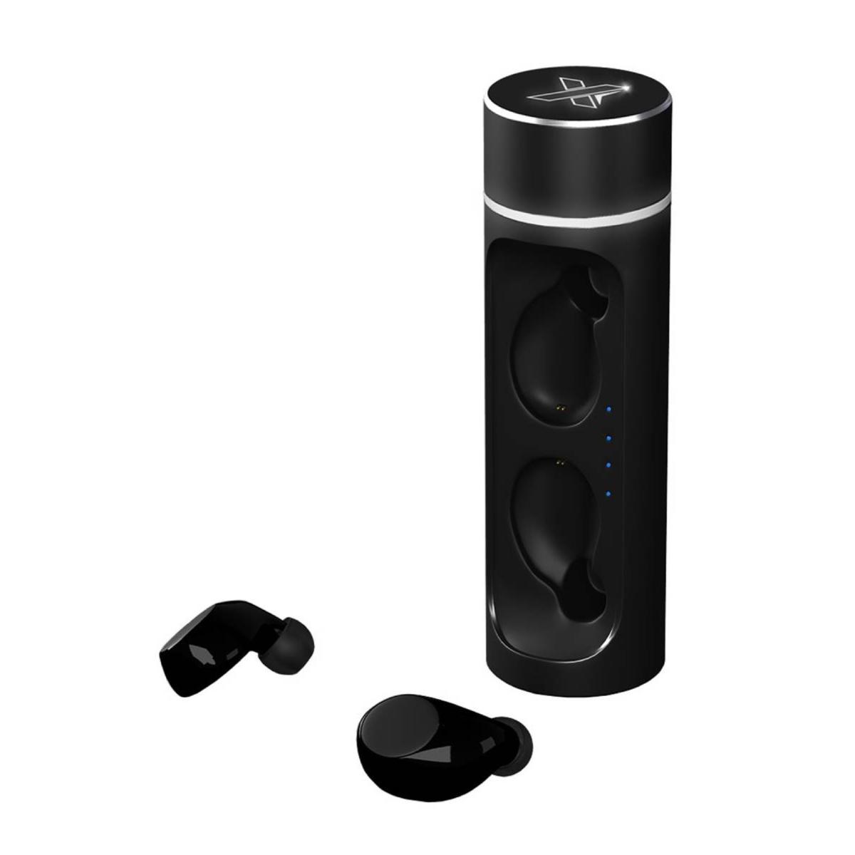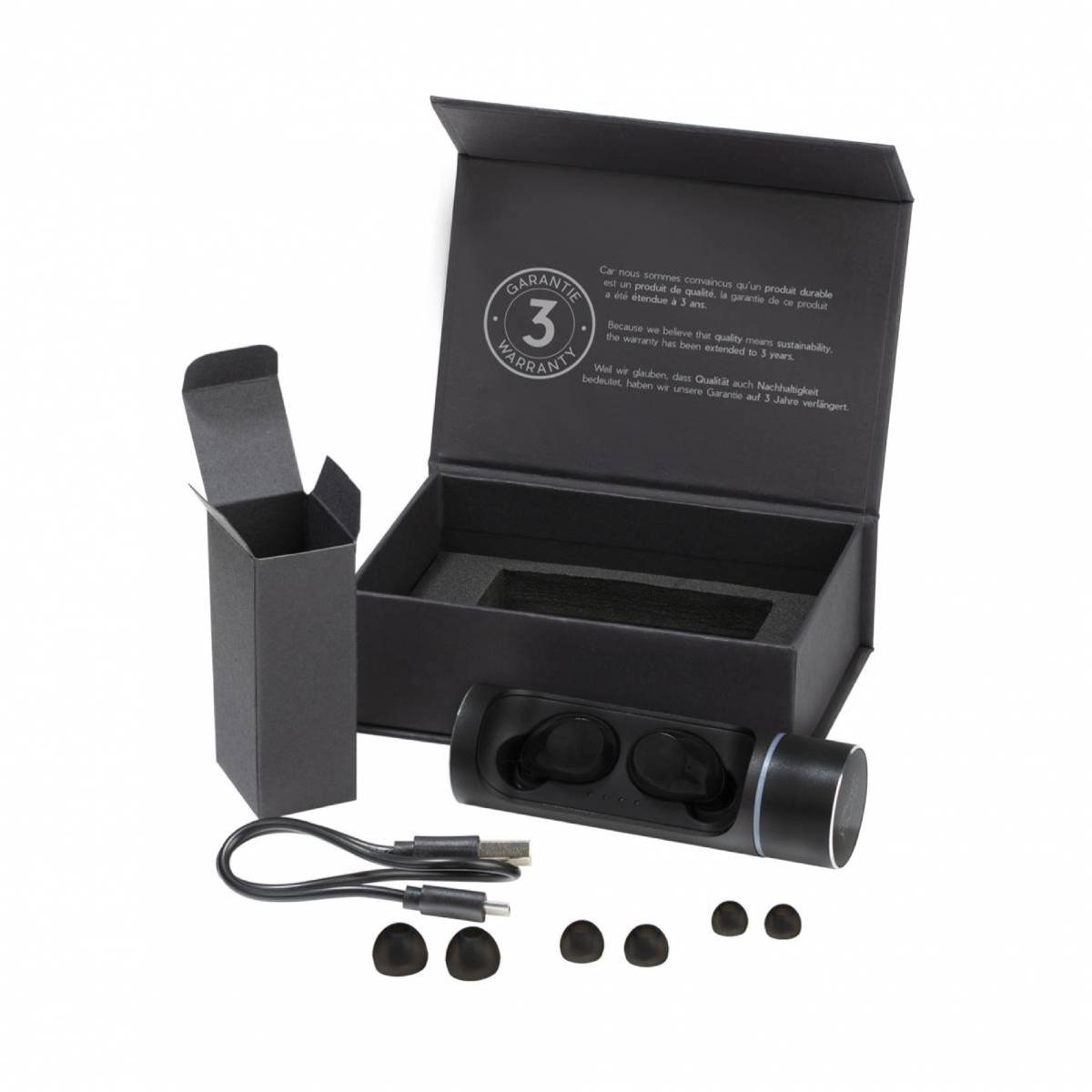 Ecouteurs avec boîtier cylindrique. Logo lumineux. Boîtier muni d'un indicateur de charge digital indiquant le niveau de batterie. Fonction micro intégrée permettant la prise d'appels téléphoniques. Trois tailles d'embouts différentes inclus.