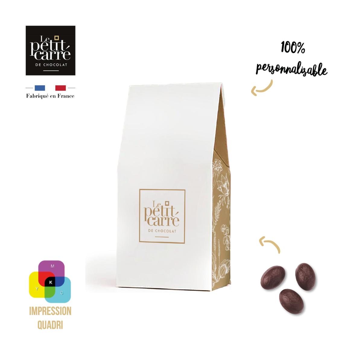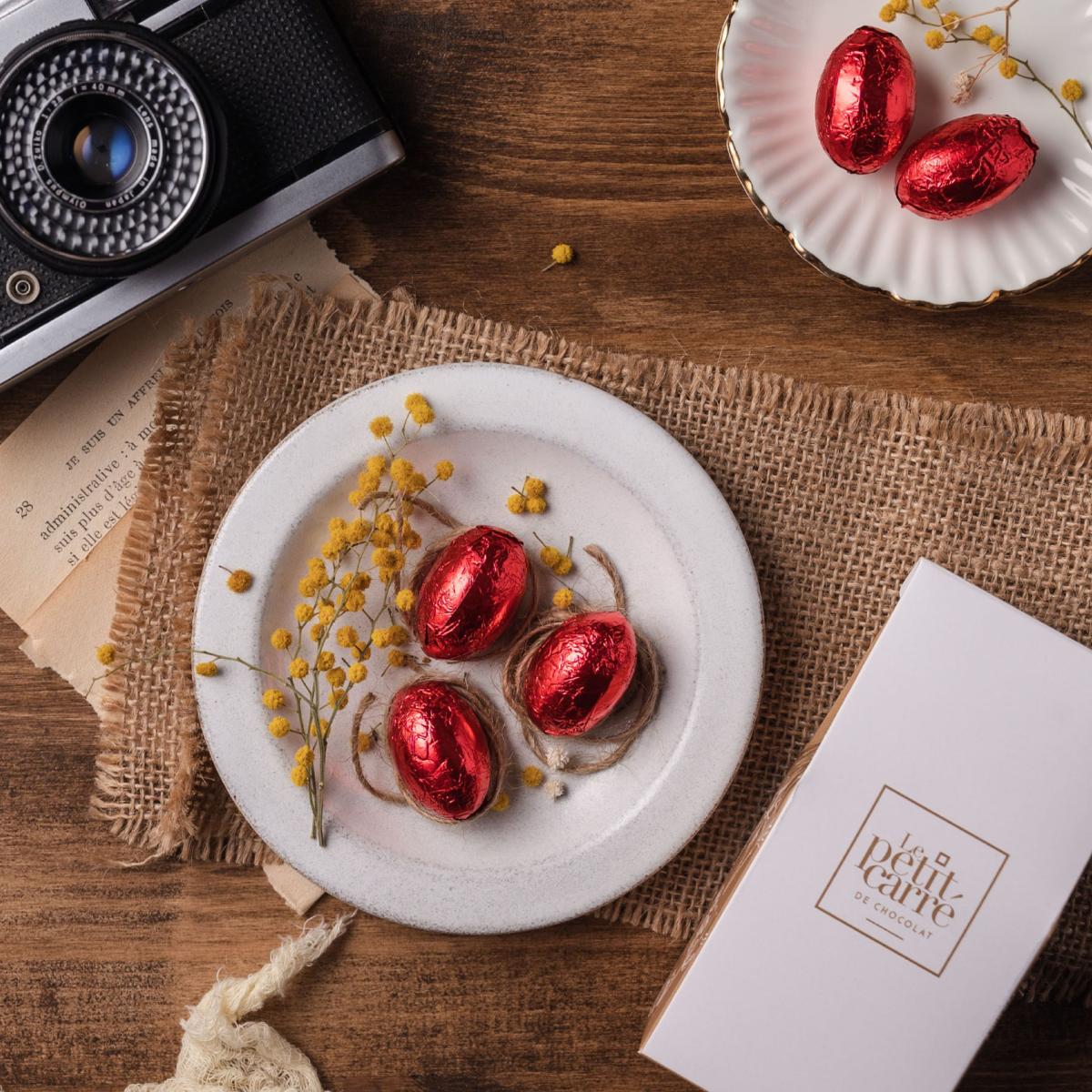 Etui d'Œuf de Pâques en chocolat avec emballage individuel alu, 50gr. Dimensions : 130 x 65 x 40 mm. Disponible en chocolat noir ou chocolat au lait.