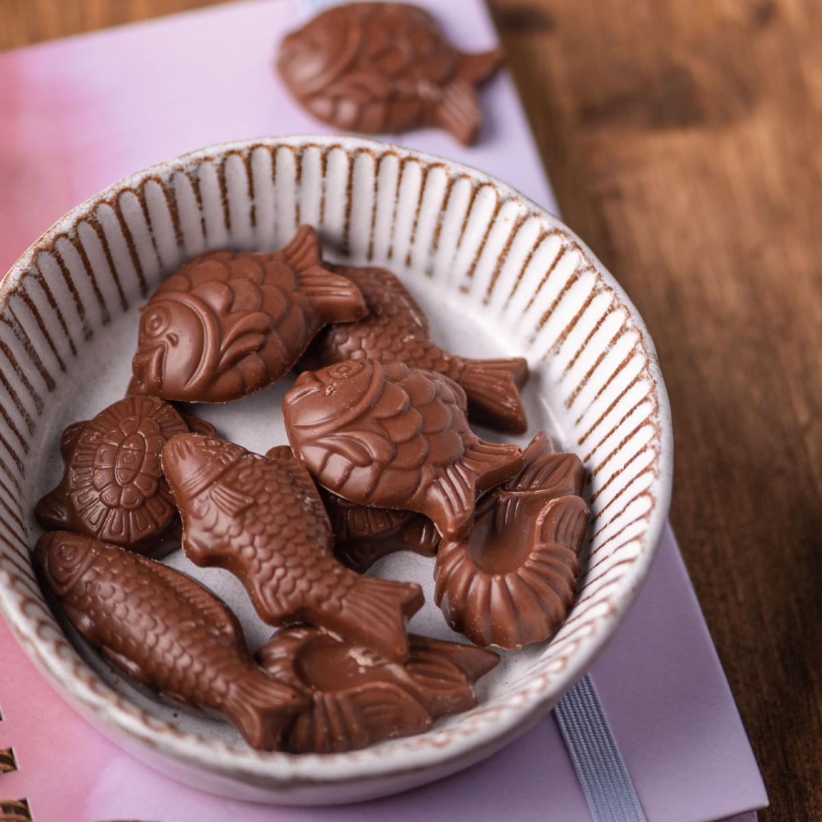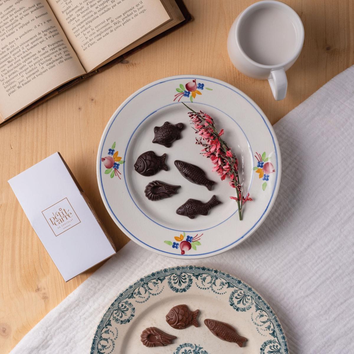 Etui de fritures de Pâques, 50gr. Dimensions : 130 x 65 x 40 mm. Disponible en chocolat noir et ou chocolat au lait (Lait 41% BIO de 50g ou Noir 70% BIO de 50g).