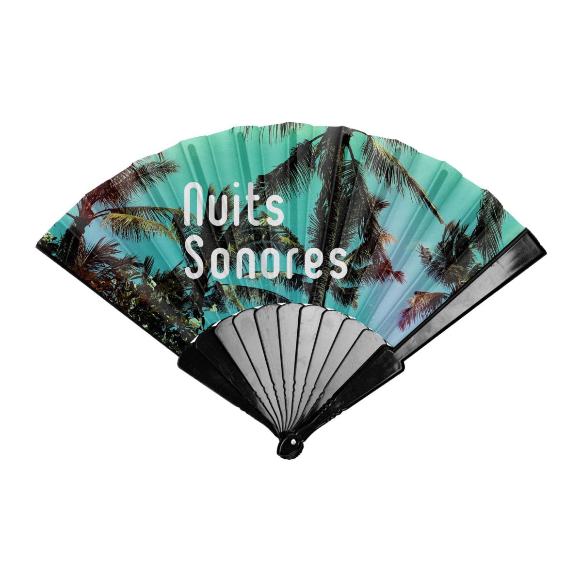 Eventail en plastique et tissu. Dimensions : 230 x 430 mm. Disponible en plusieurs coloris de plastique, selon le stock, sur demande (jaune, bleu, rouge, blanc).