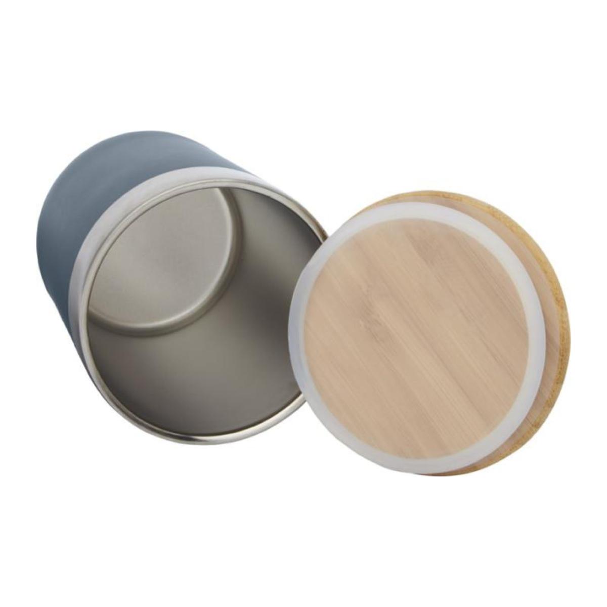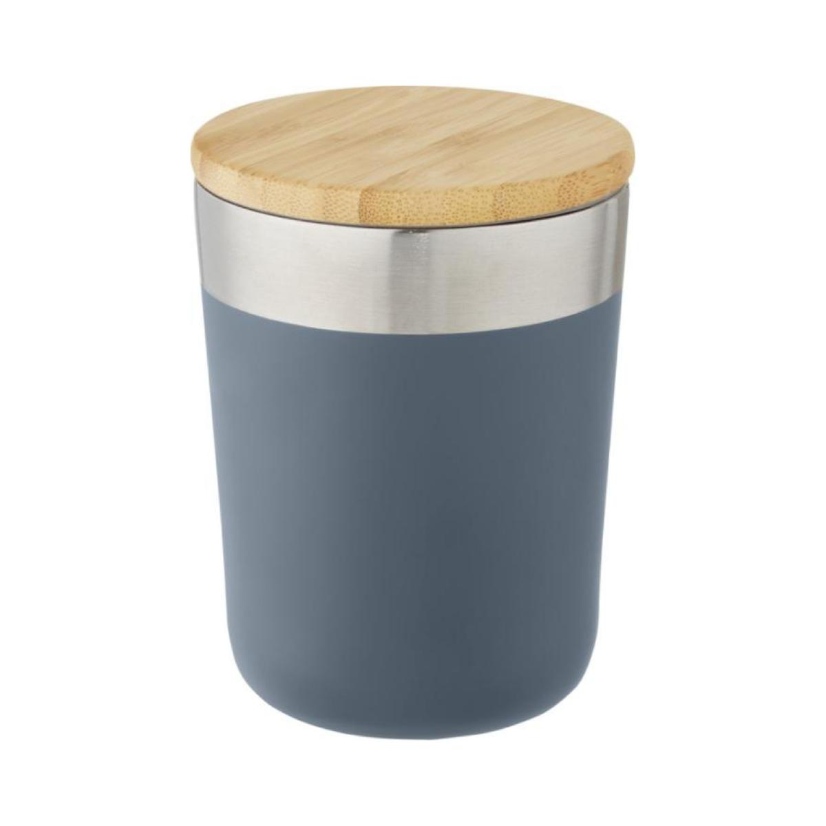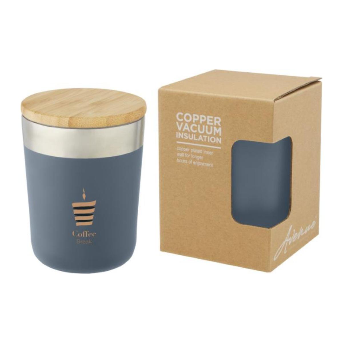Gobelet isotherme à double paroi avec couche de cuivre, au design moderne, et avec un couvercle en bambou biologique. L'acier inoxydable 18/8 avec isolation conserve les boissons chaudes ou froides pendant plusieurs heures.