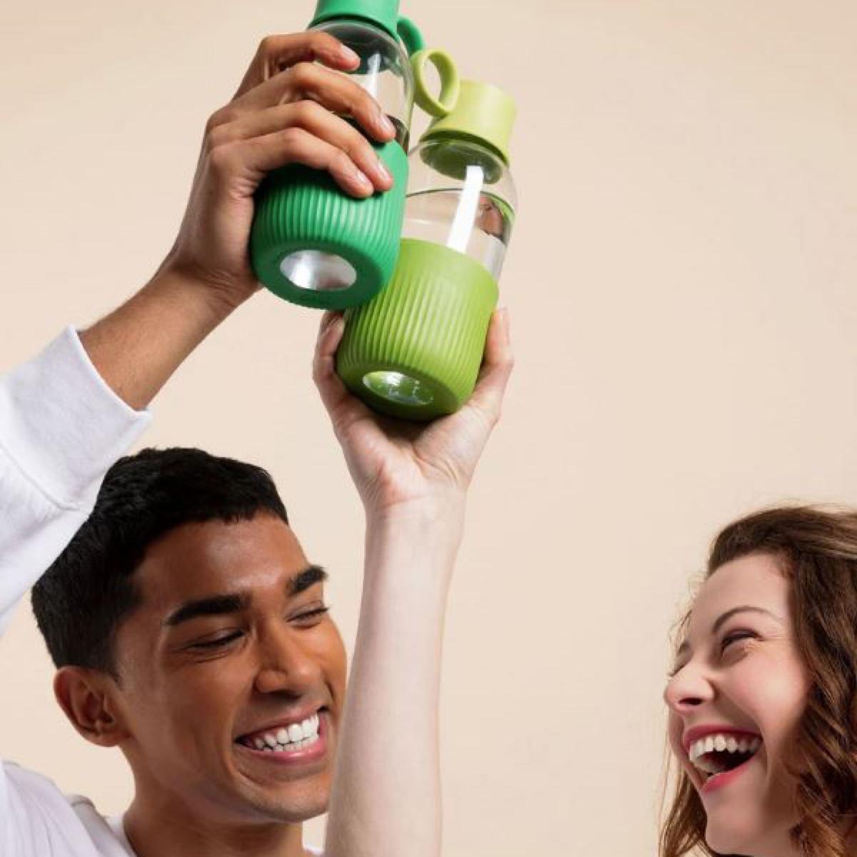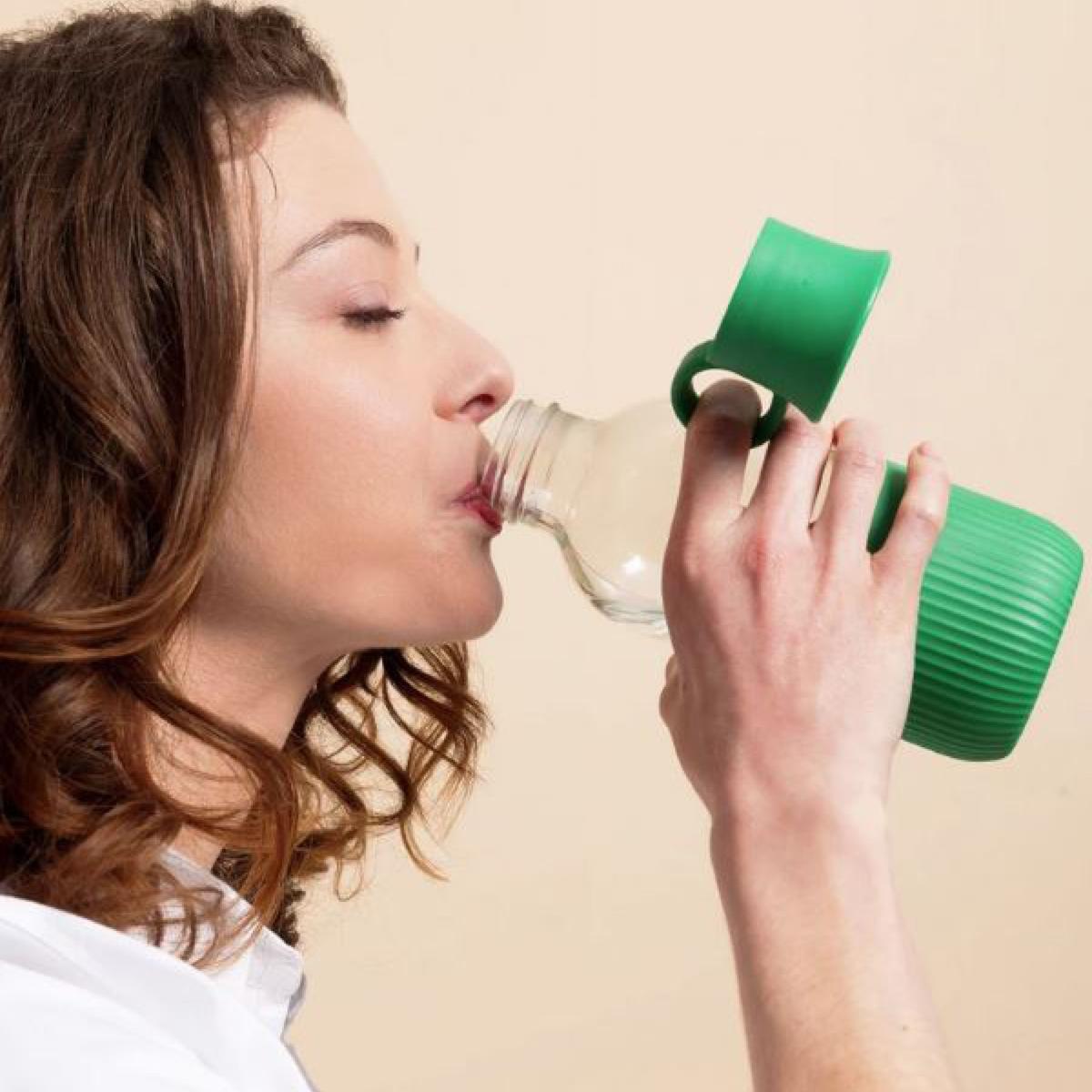 Gourde avec flacon en verre recyclé et recyclable, de la marque Gobi. Coque en plastique biosourcé. Bouchon en biocomposite, avec pas de vis et carte personnalisable (diamètre 4 cm). Lavable à la main ou au lave-vaisselle. Conception et fabrication 100% française.