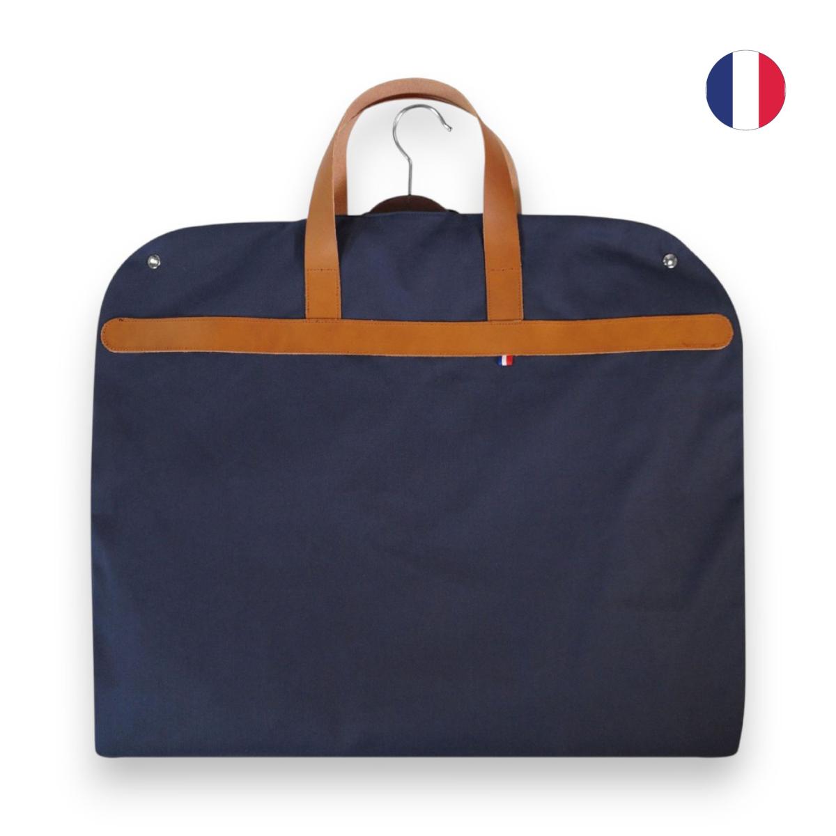 Housse à vêtements. Fermeture zippée et deux boutons pression en métal. Deux poignées cuir 3 x 48 cm. Puce Bleu/Blanc/Rouge. Dimensions 97 x 60 cm. Fabrication en France. Fabrication artisanale.