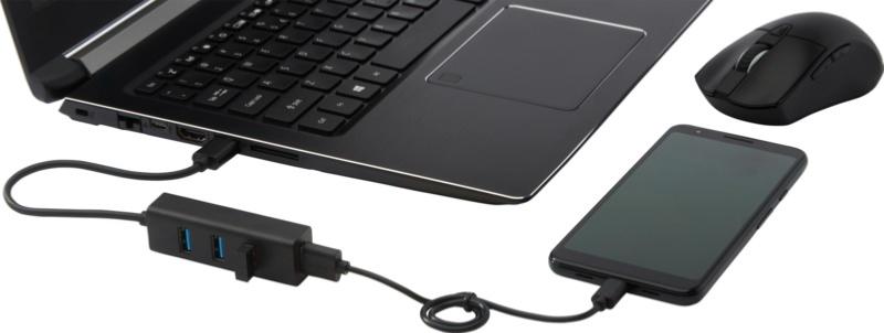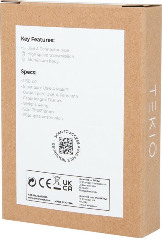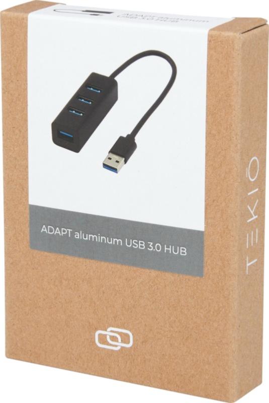 Hub USB rectangulaire dans un boîtier en aluminium avec 4 ports USB. Compatible avec USB 3.1 gén. 1 jusqu'à 5 Go/s de transmission de données et compatible avec les versions inférieures. Charge en amont de 900 mA maximum par port et charge en aval de 3 A maximum sur tous les ports USB-A. Livrée dans une boîte en papier Kraft de qualité supérieure. Aluminium, Plastique ABS.