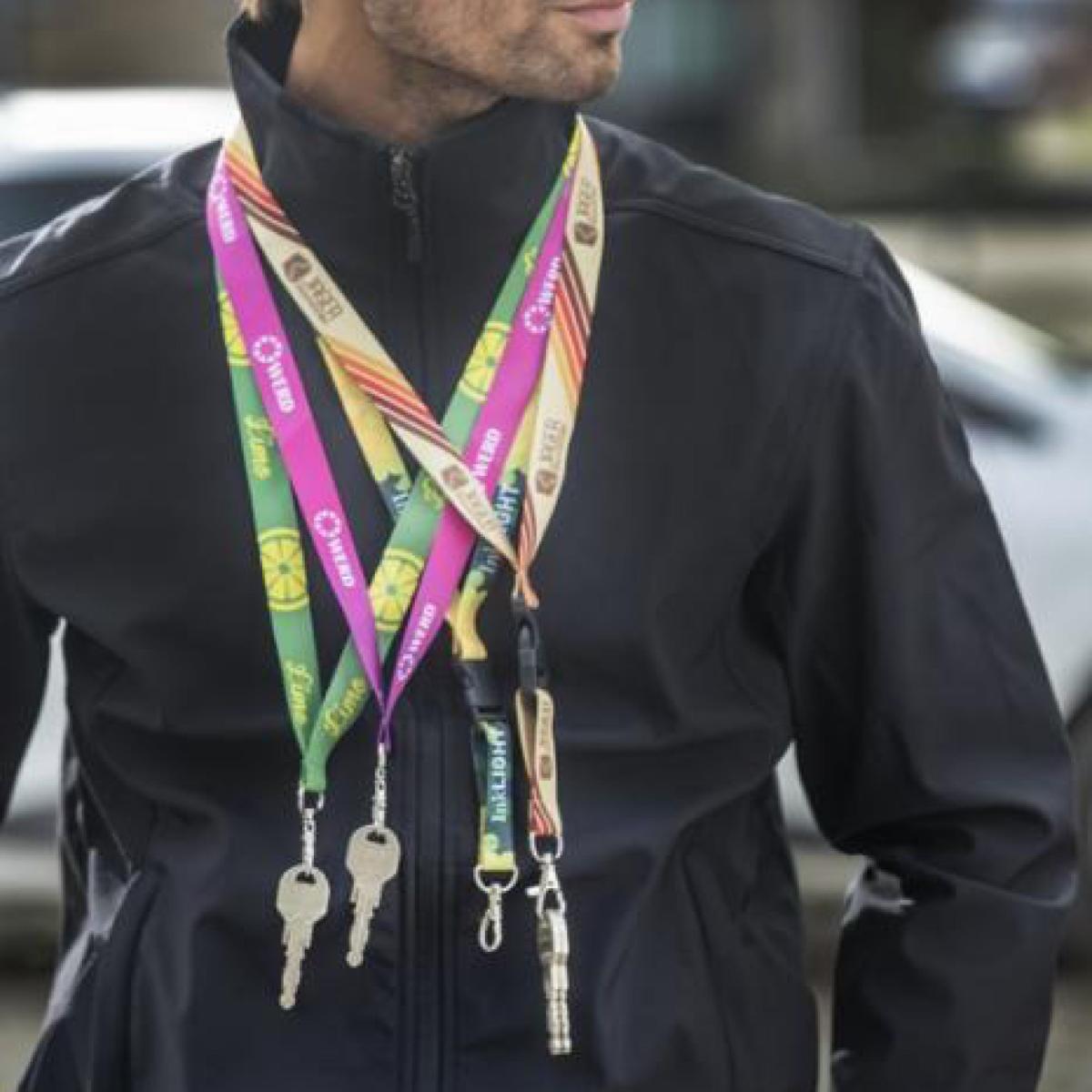 Lanière avec marquage en sublimation. Comprend le marquage sur toute la surface et sur les deux faces. Fourni avec mousqueton métal et boucle de sécurité. Disponible en 4 largeurs : 10, 15, 20 et 25 mm.