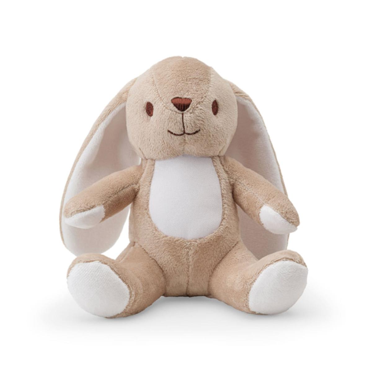 Peluche en polyester en forme de lapin, avec ventre en tissu à personnaliser. Hauteur assis : 150 mm.