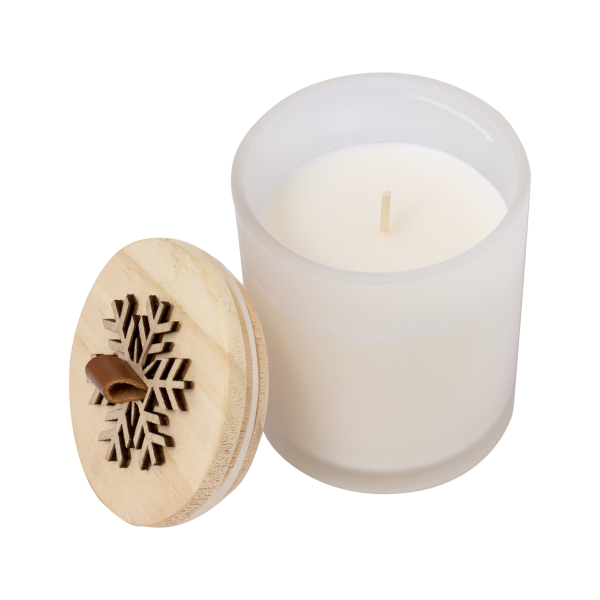 Bougie en cire parfumée à la vanille dans un support en verre, avec couvercle en bois décoré de flocons.
