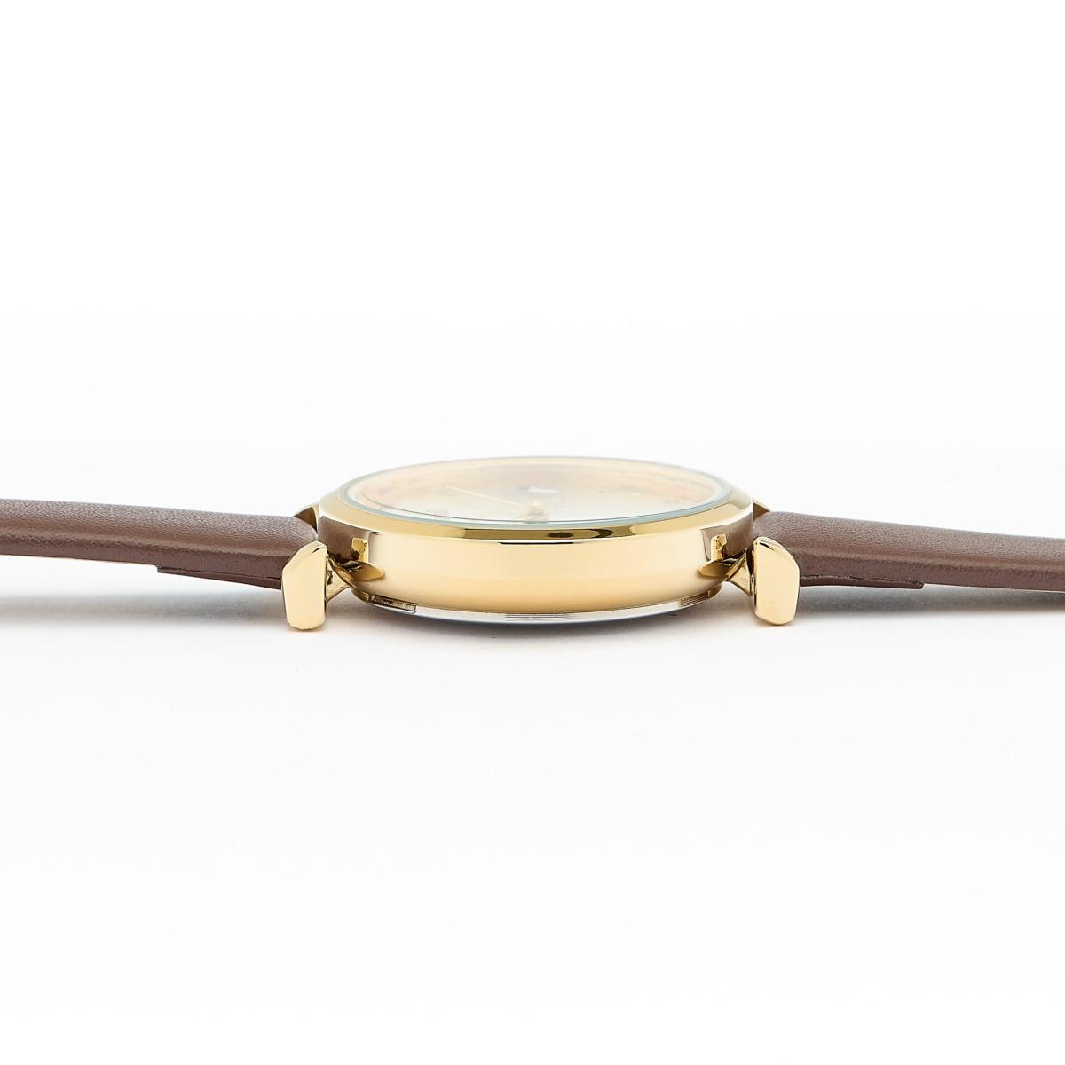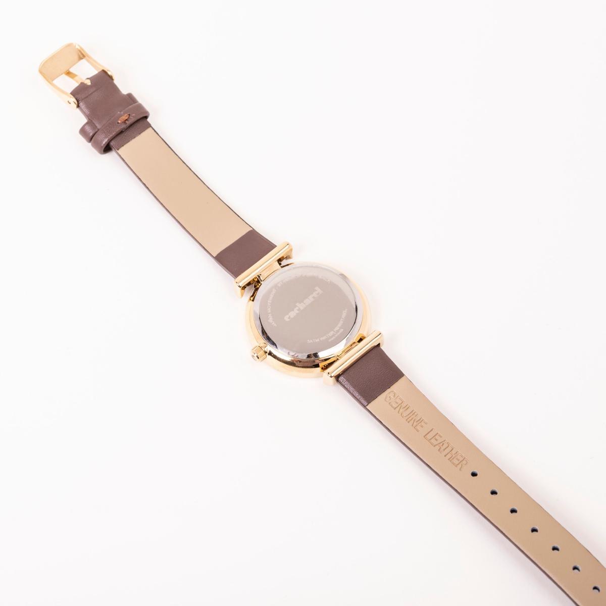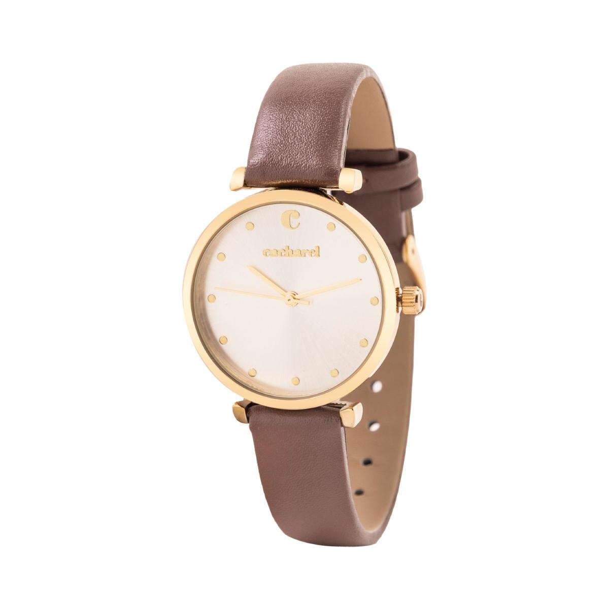 Montre avec bracelet en cuir végétal de la marque Cacharel. Tendance et discrète. Cadran brillant ensoleillé. Boîtier en or. Bracelet en cuir véritable souple. Beauté intemporelle. Tons neutres.