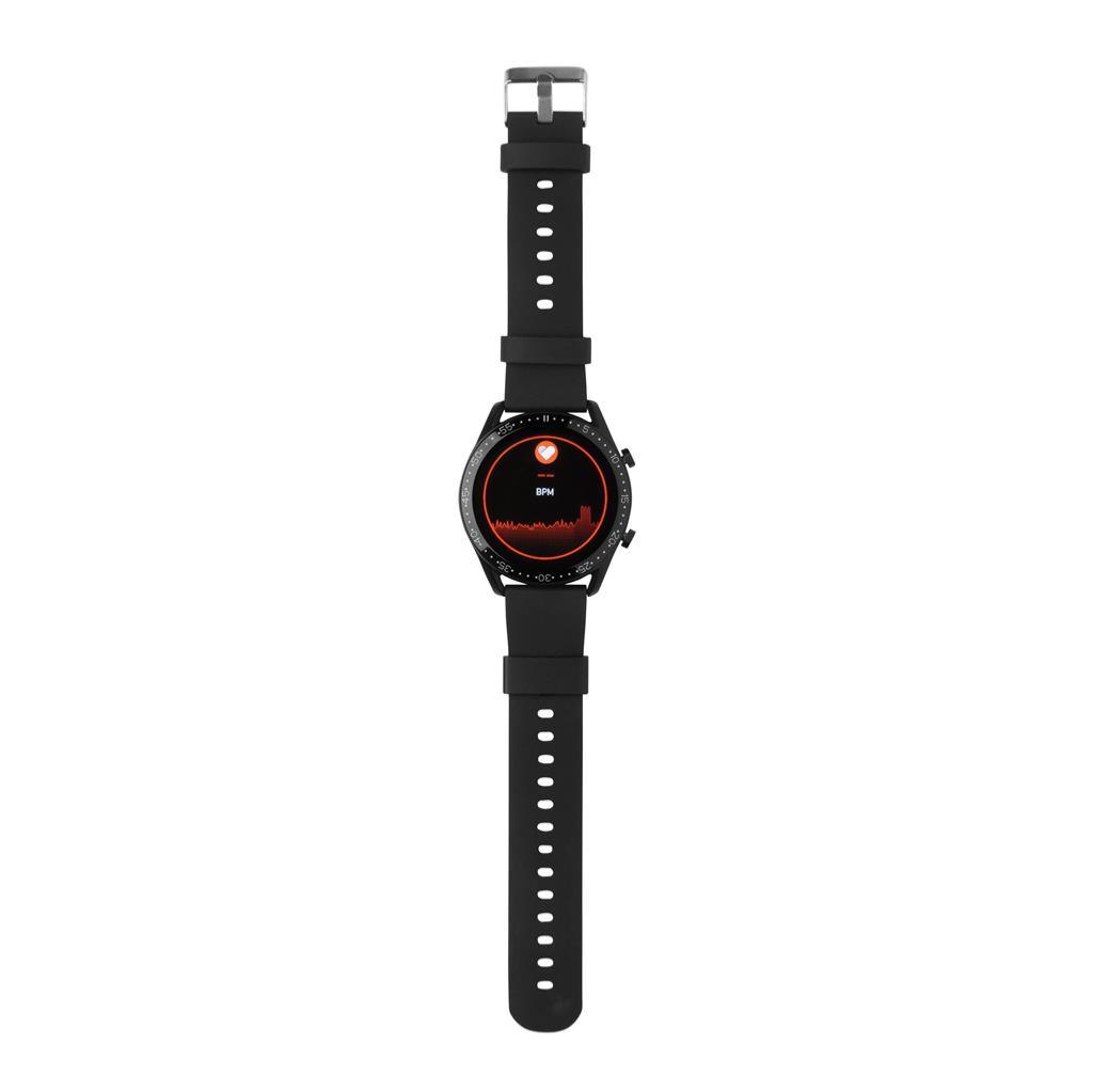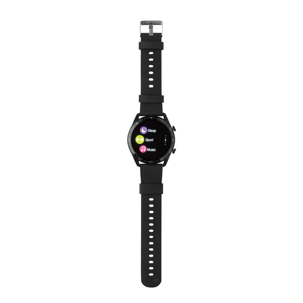 Montre moderne avec écran tactile de 1,28 pouces pour suivre vos activités tout au long de la journée. Avec micro intégré pour répondre aux appels téléphoniques sur sa montre. Fabriquée avec un bracelet en TPU recyclé certifié RCS (Recycled Claim Standard) et un cadre métallique. Contenu recyclé total : 22 % sur la base du poids total de l'article. La certification RCS garantit une chaîne d'approvisionnement entièrement certifiée pour les matériaux recyclés. Chargeur à clip inclus pour charger la montre. Article et accessoires 100% sans PVC.Caractéristiques : Compteur de pas, calories, distance, suivi multisports réveil, suivi de la fréquence cardiaque, surveillance de la pression artérielle, moniteur de sommeil, mises à jour du calendrier, passer et recevoir des appels, notifications : SMS, Facebook, Skype, WhatsApp, Twitter, etc. Compatible avec Android 4.4 et IOS 8.0 et plus. BT 4.0. Temps de veille de 15 jours et temps de travail jusqu'à 5 jours.