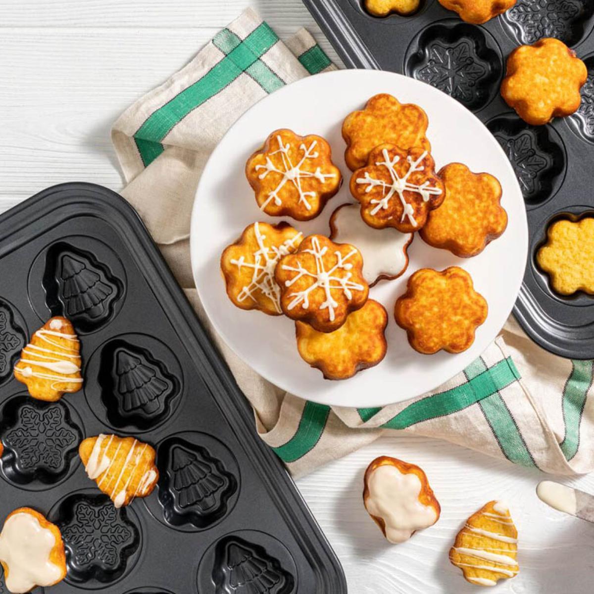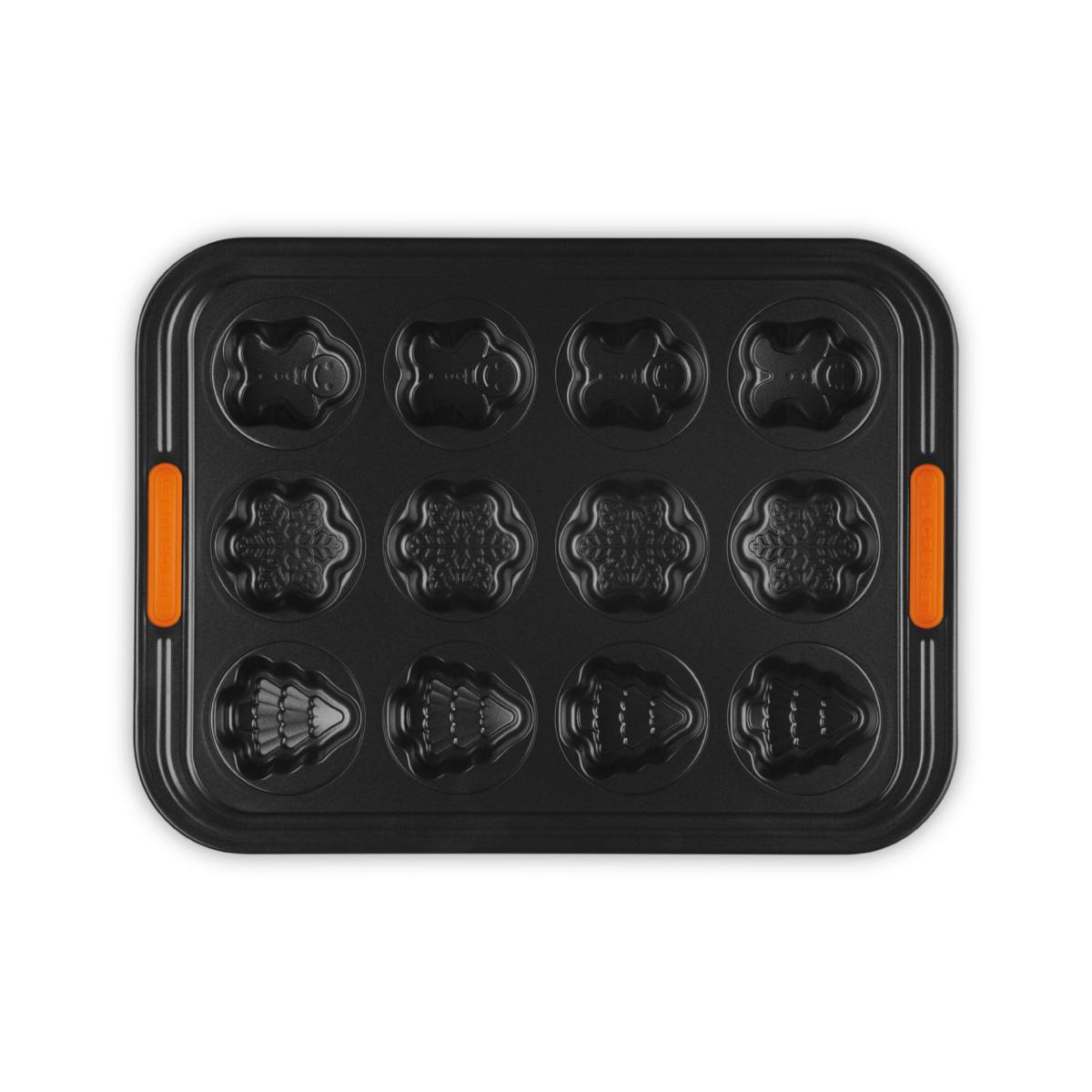 Moule à 12 muffins aux formes festives, de la marque Le Creuset. Donnez aux fêtes une magie vraiment spéciale avec ces pâtisseries festives qui apportent du baume au cœur. Ce bel ensemble réunit trois adorables formes de saison : un bonhomme en pain d’épices, un flocon de neige et un sapin de Noël. L’acier au carbone répartit la chaleur uniformément et le revêtement antiadhérent facilite votre vie en cuisine.