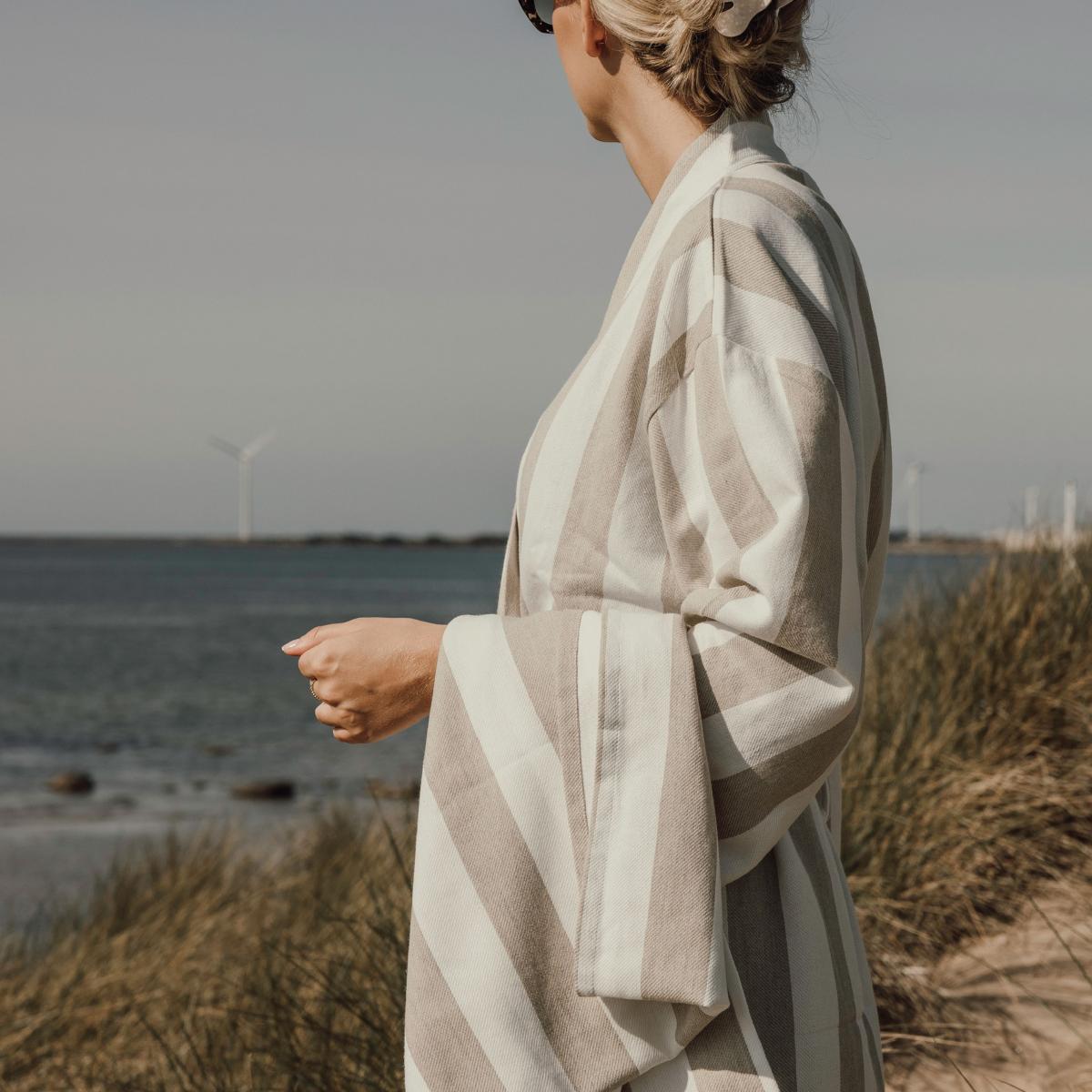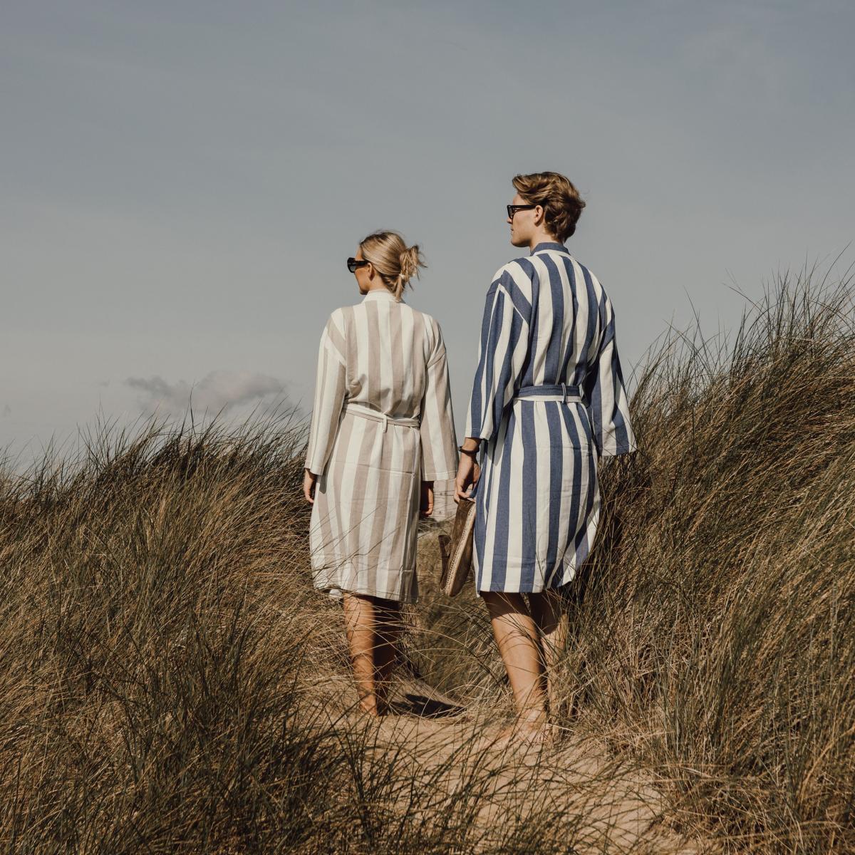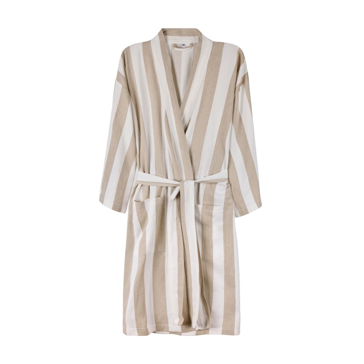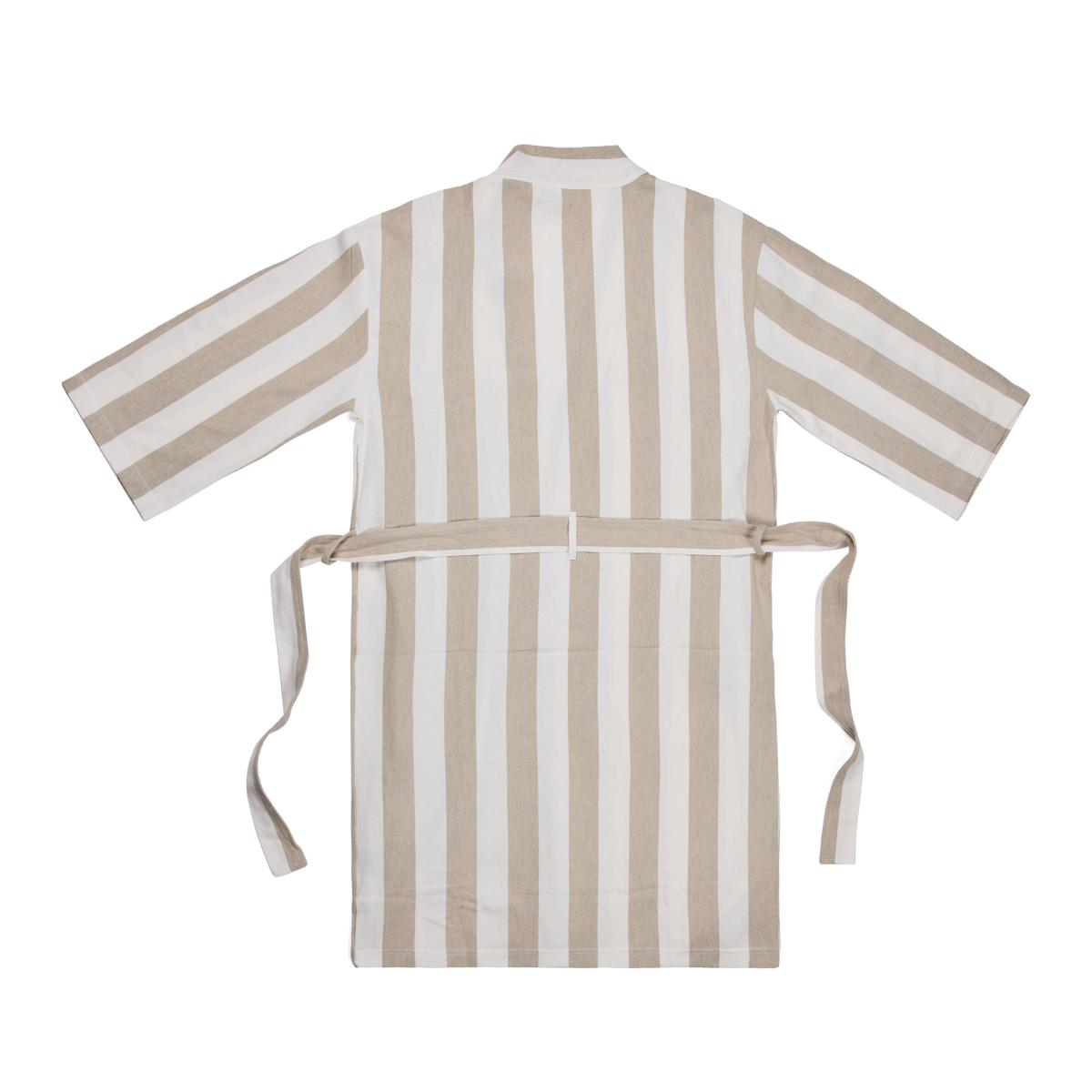 Peignoir de hammam doux et confortable. Léger, aérien et confortable. Séchage rapide. Style classique avec motif rayé bicolore. Col soigné. Poches sur le devant. Manches 3/4. Ceinture à la taille. Certifié par GRS (Global Recycled Standard) garantissant la certification de l'ensemble de la chaîne d'approvisionnement des matériaux recyclés.