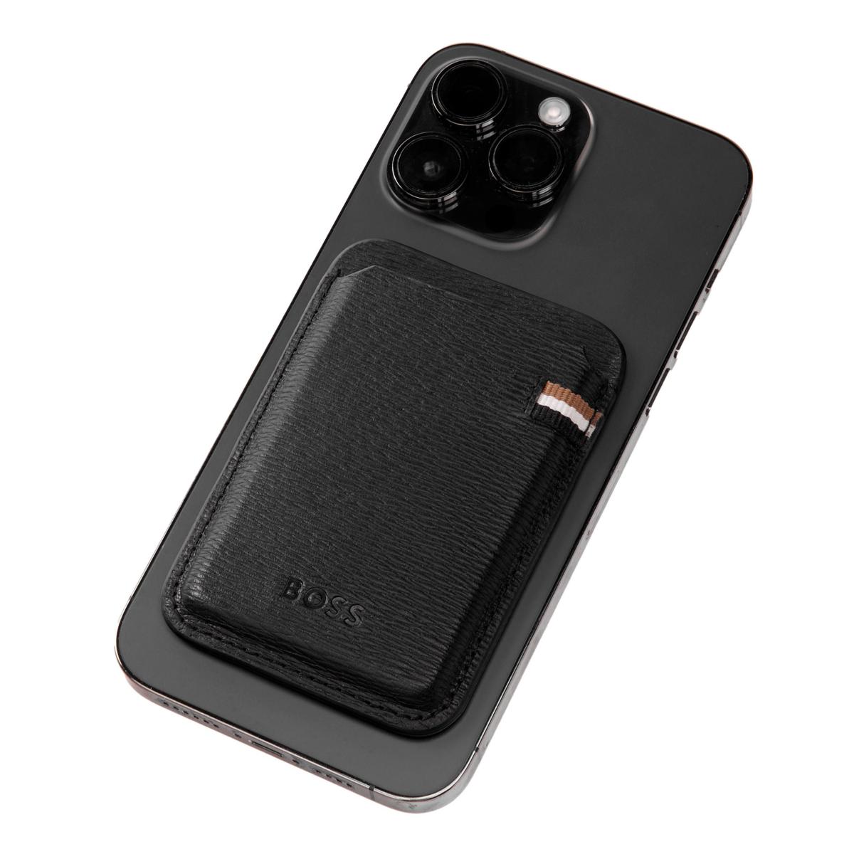 Porte-cartes magnétique de la marque Hugo Boss. Cuir véritable de première qualité. Système MagSafe intégré. Logo BOSS. Doublure monogrammée. Design minimal et compact. Cinq cartes. Style, fonctionnalité et innovation.