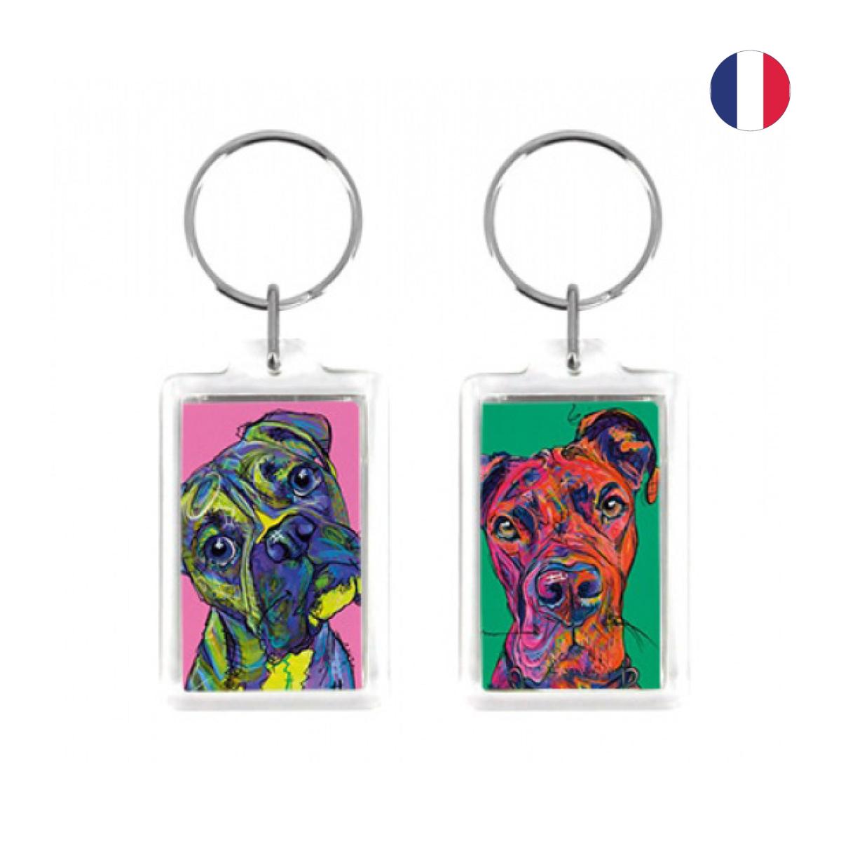 Porte-clé rectangulaire. Dimensions : 31 x 50 cm / Marquage 25 x 40 mm / Epaisseur 5 mm. Impression recto/verso de haute qualité, protégée par une loupe transparente. Fourni avec anneau. Disponible en métal ou en plastique acrylique.