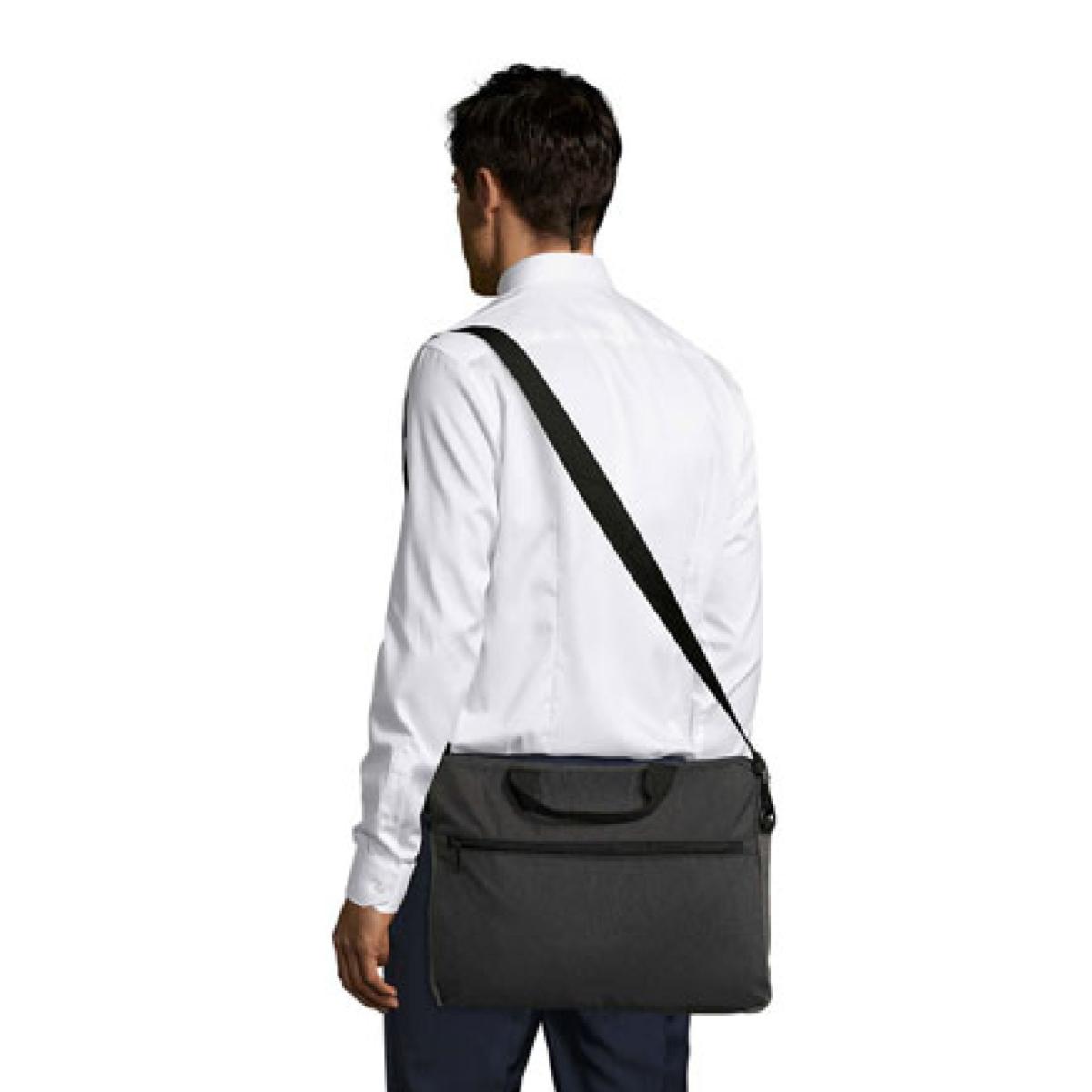 Porte-documents bi-matière. Compartiment central zippé double curseur. Poche frontale zippée. Poche intérieure zippée. Intérieur renforcé. Anses porté main de 3 x 29cm. Bandoulière ajustable et amovible en coton.