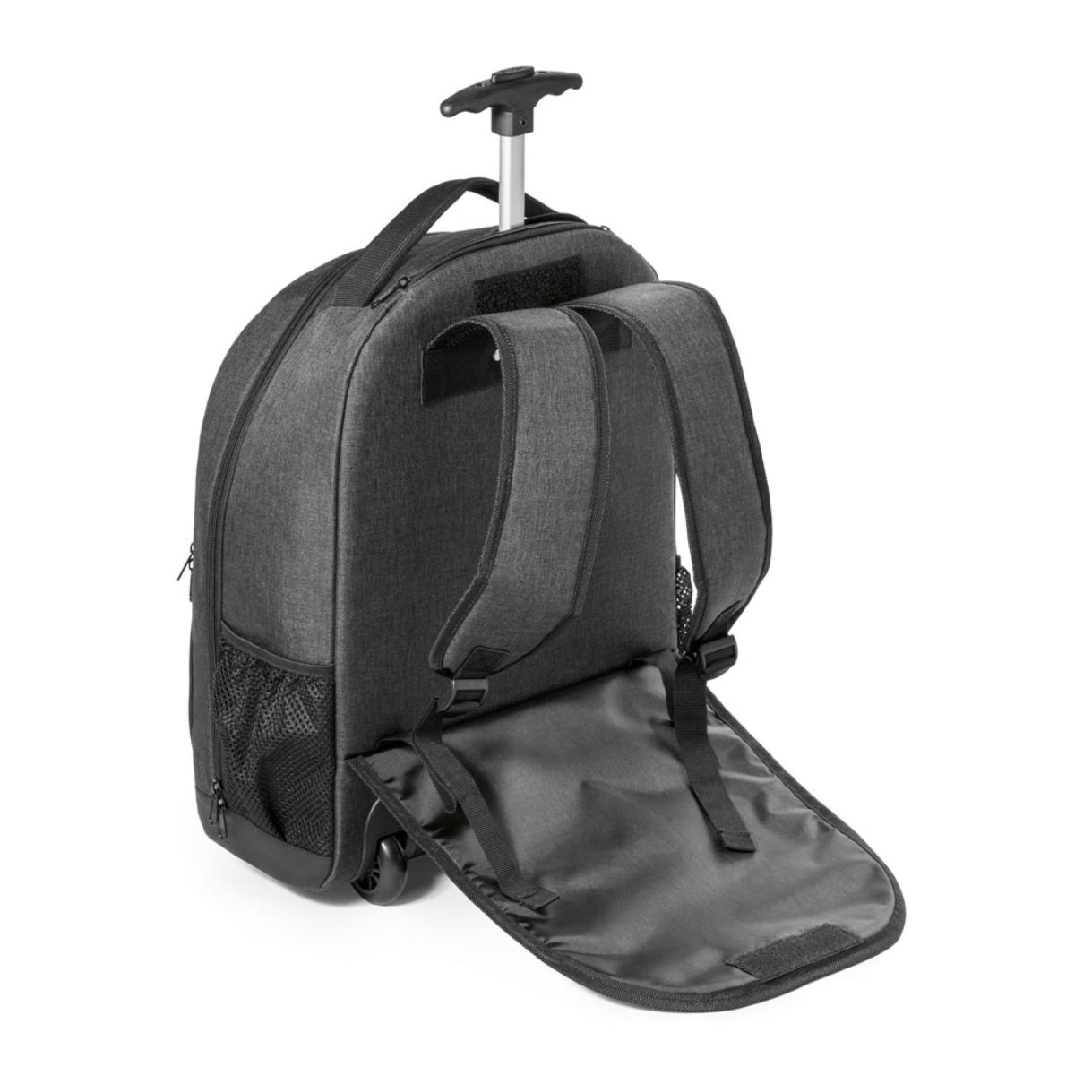 Sac à dos trolley pour ordinateur portable 15.6'' en polyester 600D. Sac à dos à roulettes pour garantir une plus grande mobilité et une grande facilité lors de longs trajets. Poche pour ordinateur: 15,6 pouces. Capacité (L): 21. Un compartiment principal. Deux poches avant zippées et deux poches latérales en filet. Protection rembourrée pour les roulettes ; poignée métallique extensible ; plaque métallique amovible aimantée pour la personnalisation (50 x 20 mm). Dimensions : 340 x 430 x 170 mm.