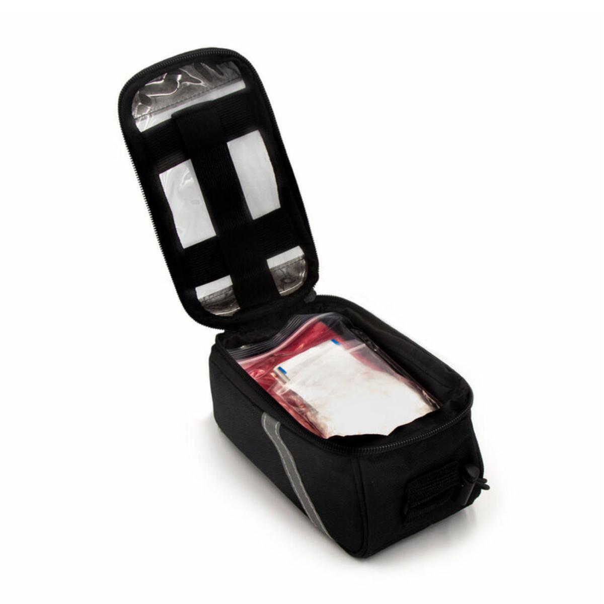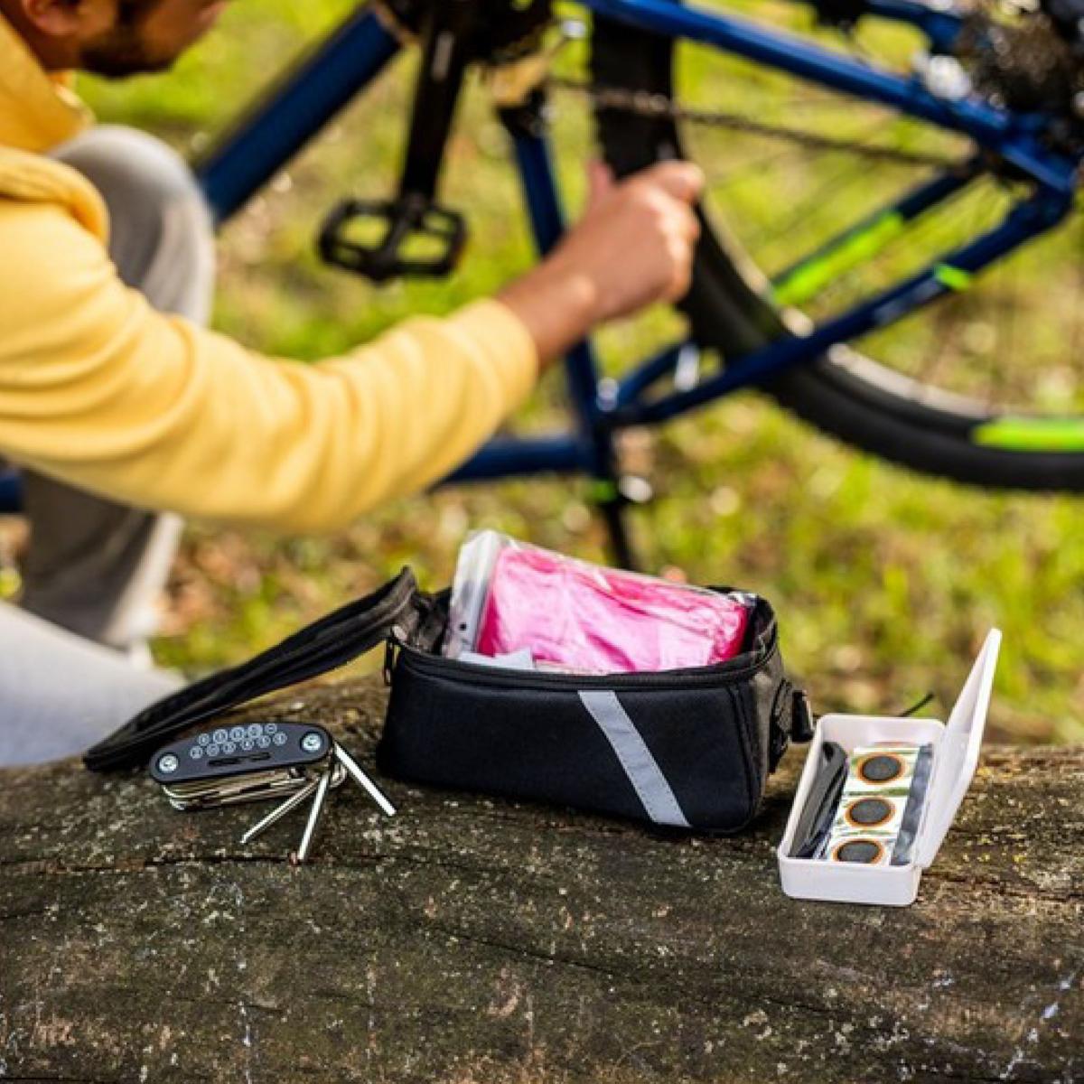 Sac de vélo avec accessoires : patchs ronds (8 pièces), colle, broyeur, pieds de biche en plastique (2 pièces), poncho jetable, clé multifonction, trousse de premiers soins (8 pansements 72 x 19 mm, 4 pansements 55 x 19 mm, 4 pansements ronds Ø20 mm, 6 lingettes antiseptiques, 1 lingette savonneuse, 1 lingette nettoyante, gants en vinyle).