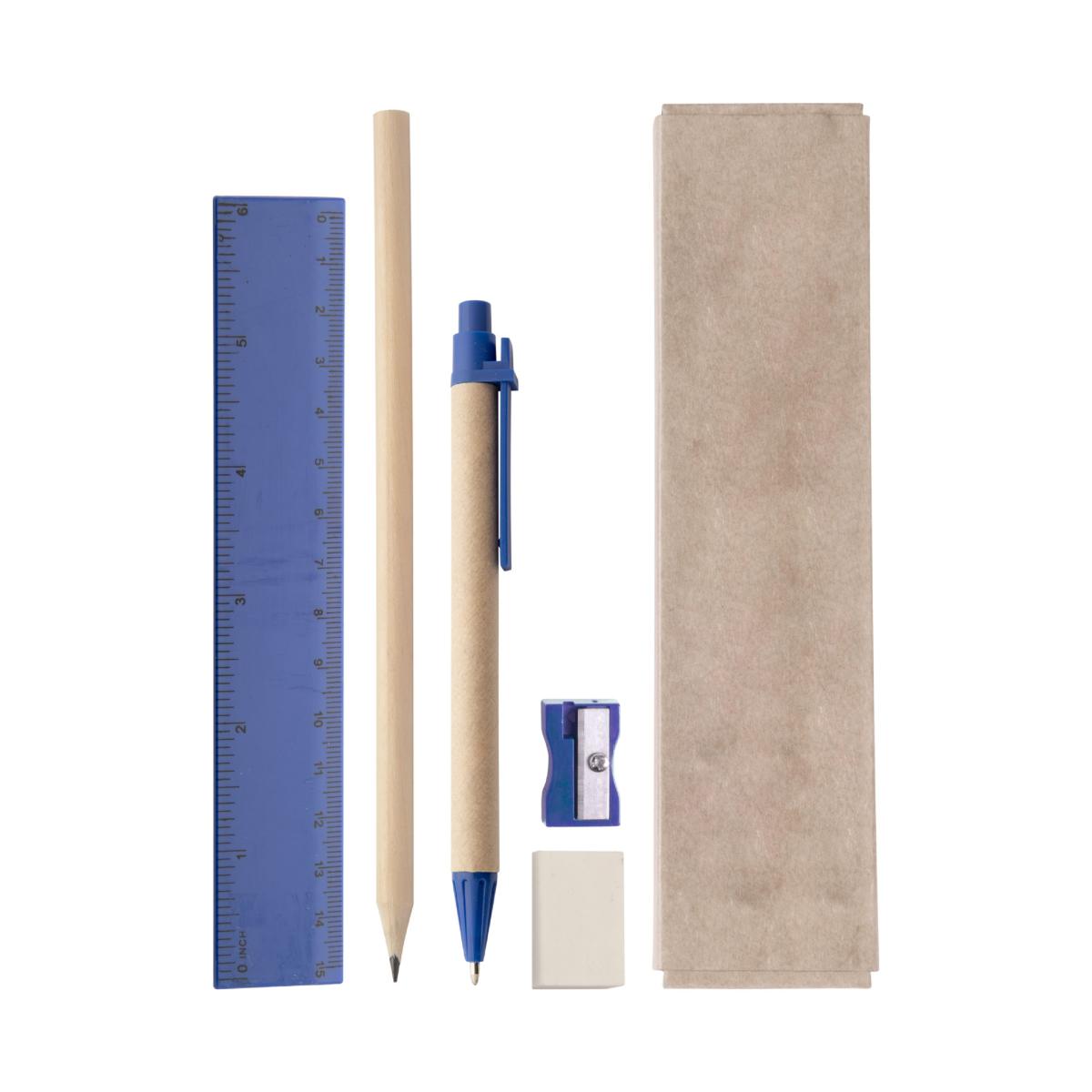 Set de cinq articles dans une boîte en carton : stylo à bille en papier recyclé (encre bleue), crayon papier, règle et gomme.