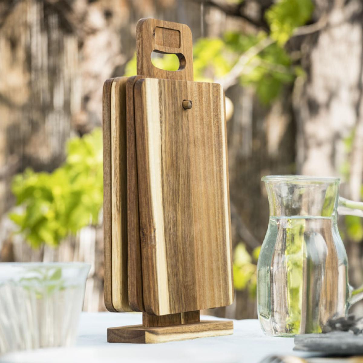 Set de quatre planches à tapas en acacia massif, résistante à l'humidité. Support vertical en acacia également pour un rangement optimisé. Dimensions de chaque planche : 26 x 17 x 1cm. Plaque en métal finition titane sur le support. Peuvent aussi servir de planches à découper.