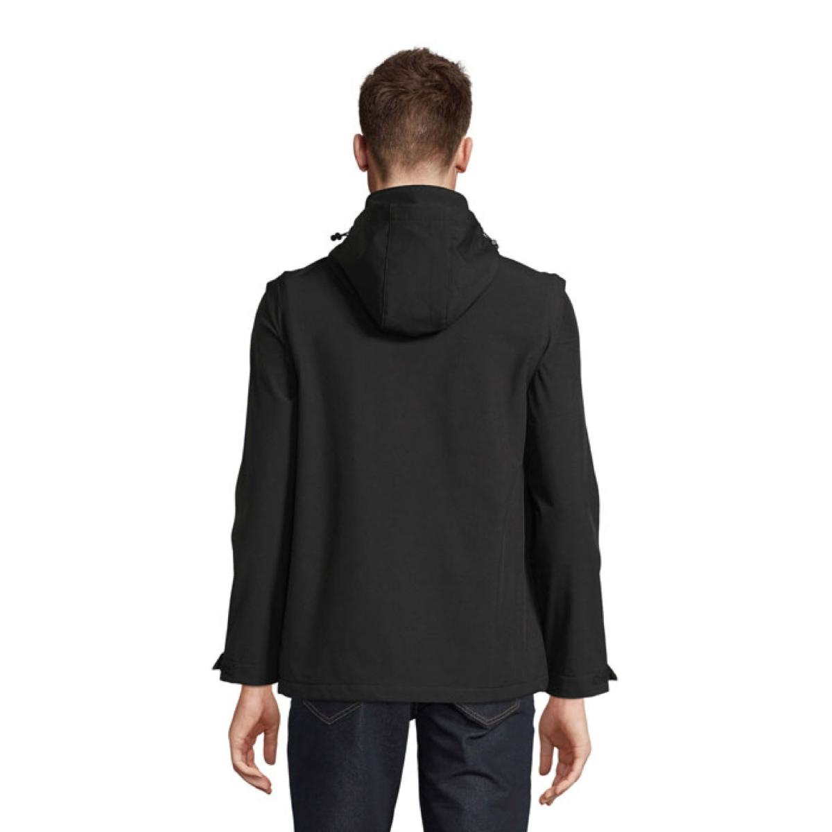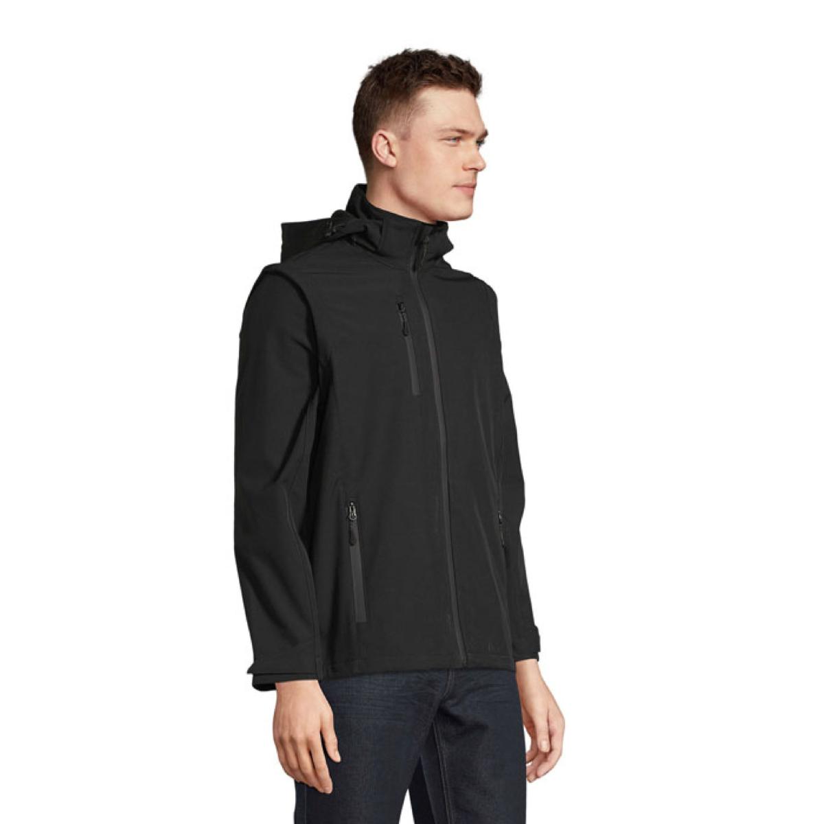 Softshell à capuche et manches amovibles pour homme. Fermeture par zip en nylon. Capuche et bas élastiqués ajustables. Poignets ajustables avec bande auto-agrippante. Poche intérieure avec zip en nylon. Membrane imperméable et respirante.