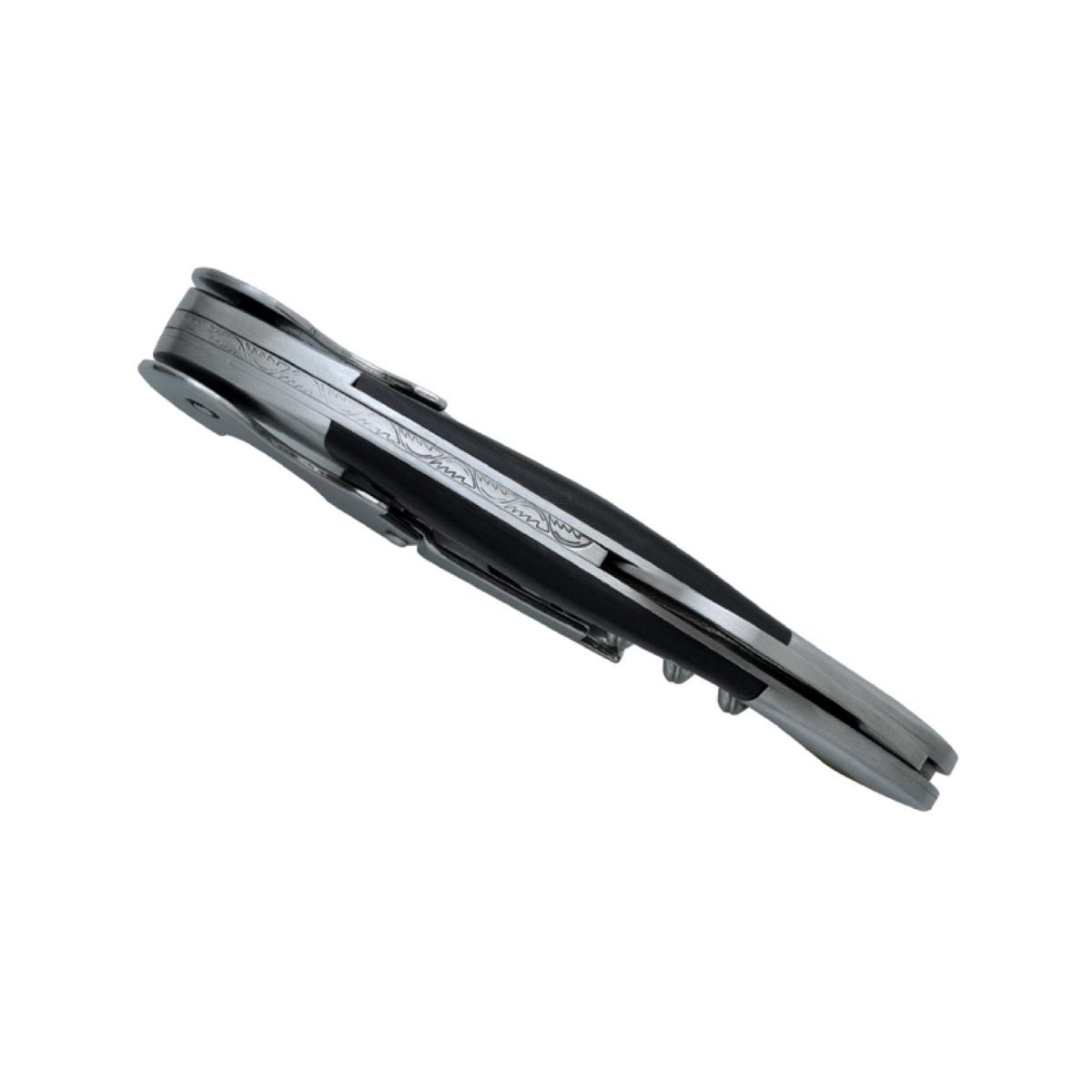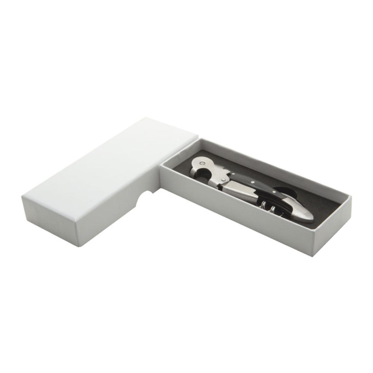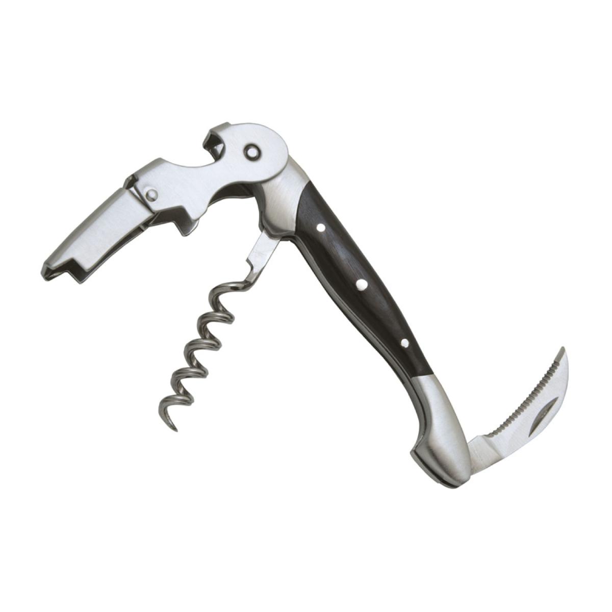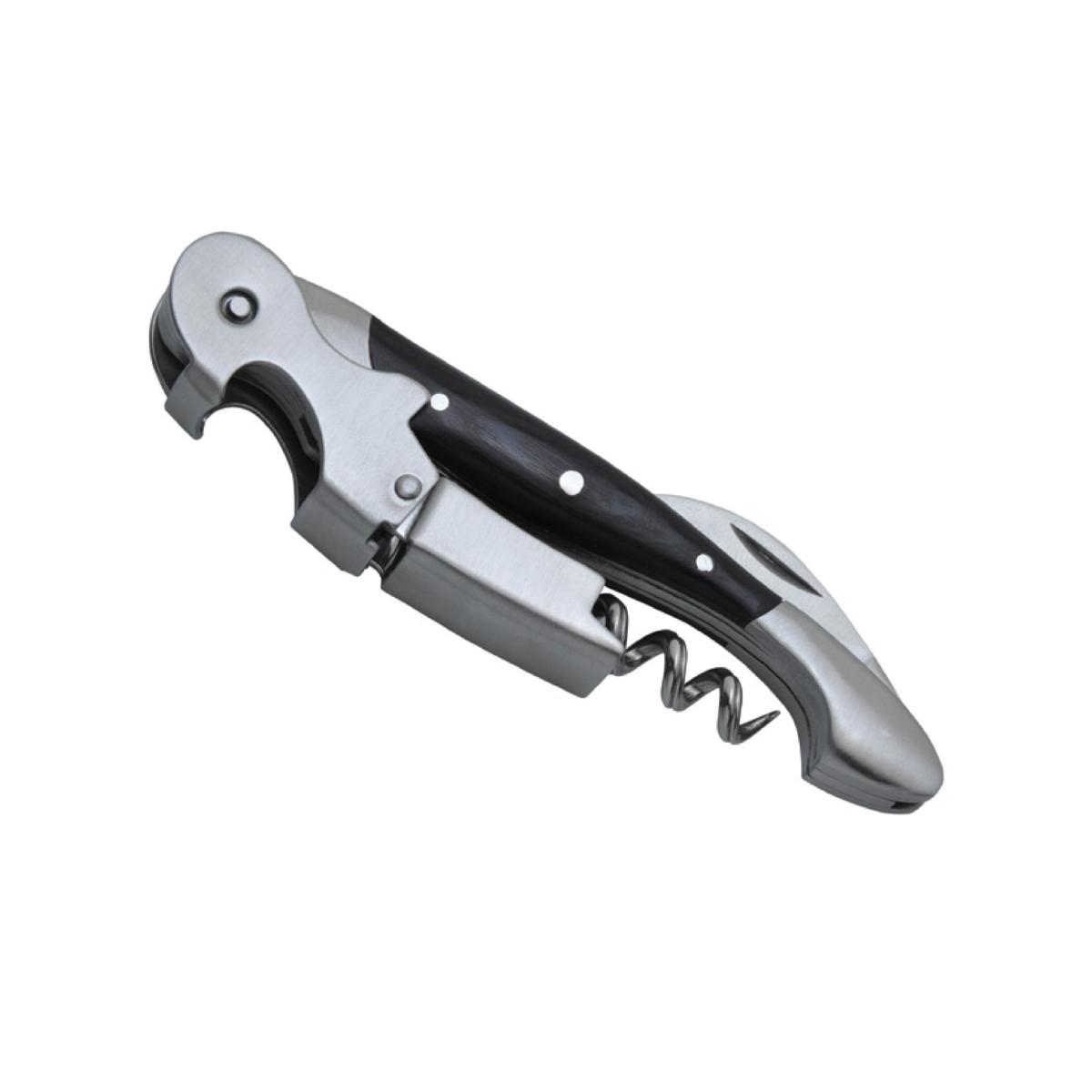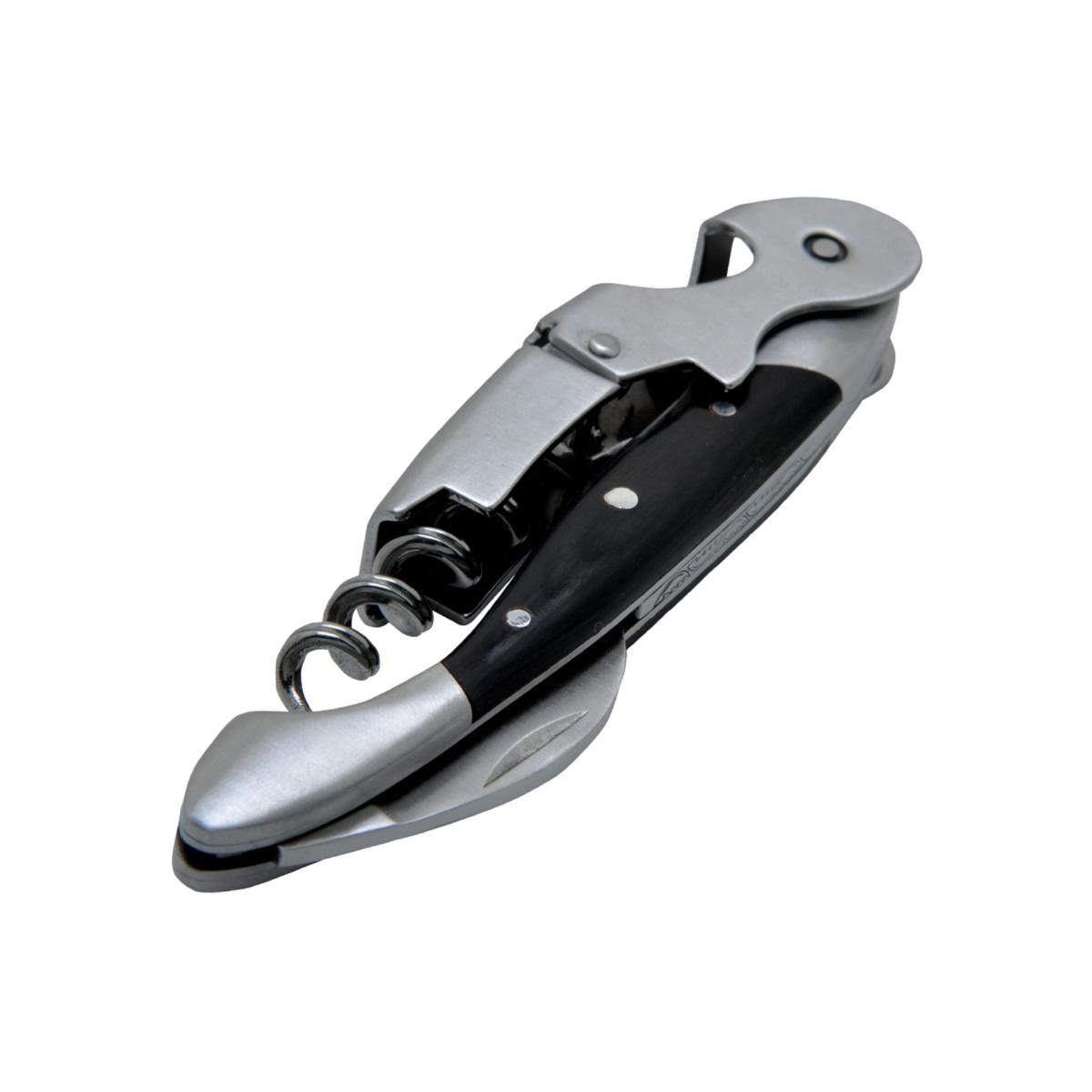 Tire-bouchon sommelier professionnel double levier. Ouverture en silence et sans difficulté. Décapsuleur sur l'extérieur. Mèche spirale en acier inoxydable. Deux mitres pleines en acier inoxydable. Lame coupe collerette micro-dentée. Manche en stamina noir avec dessin "feuille de vigne" et acier inoxydable. Livré dans un coffret.