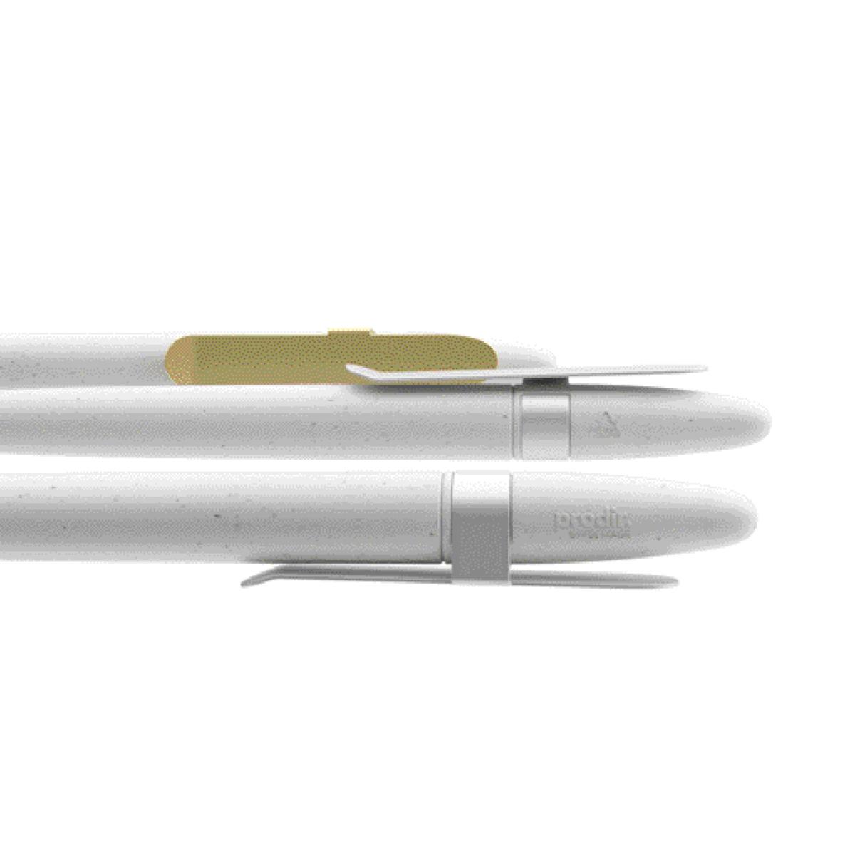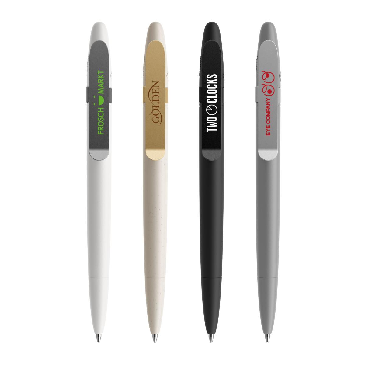 Stylo à bille de la marque Prodir, avec système pivotant et corps en plastique (ABS) 100 % recyclé pour les versions noires et blanches, 50% pour les autres coloris. Finition soft-touch. Clip en métal (disponible dans plusieurs couleurs, sur demande).