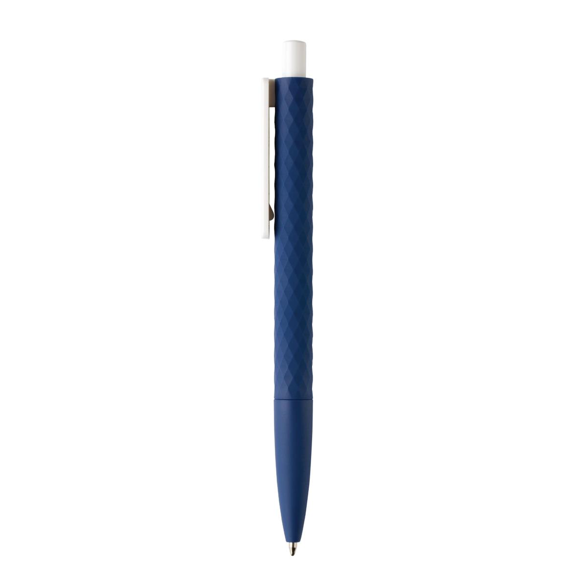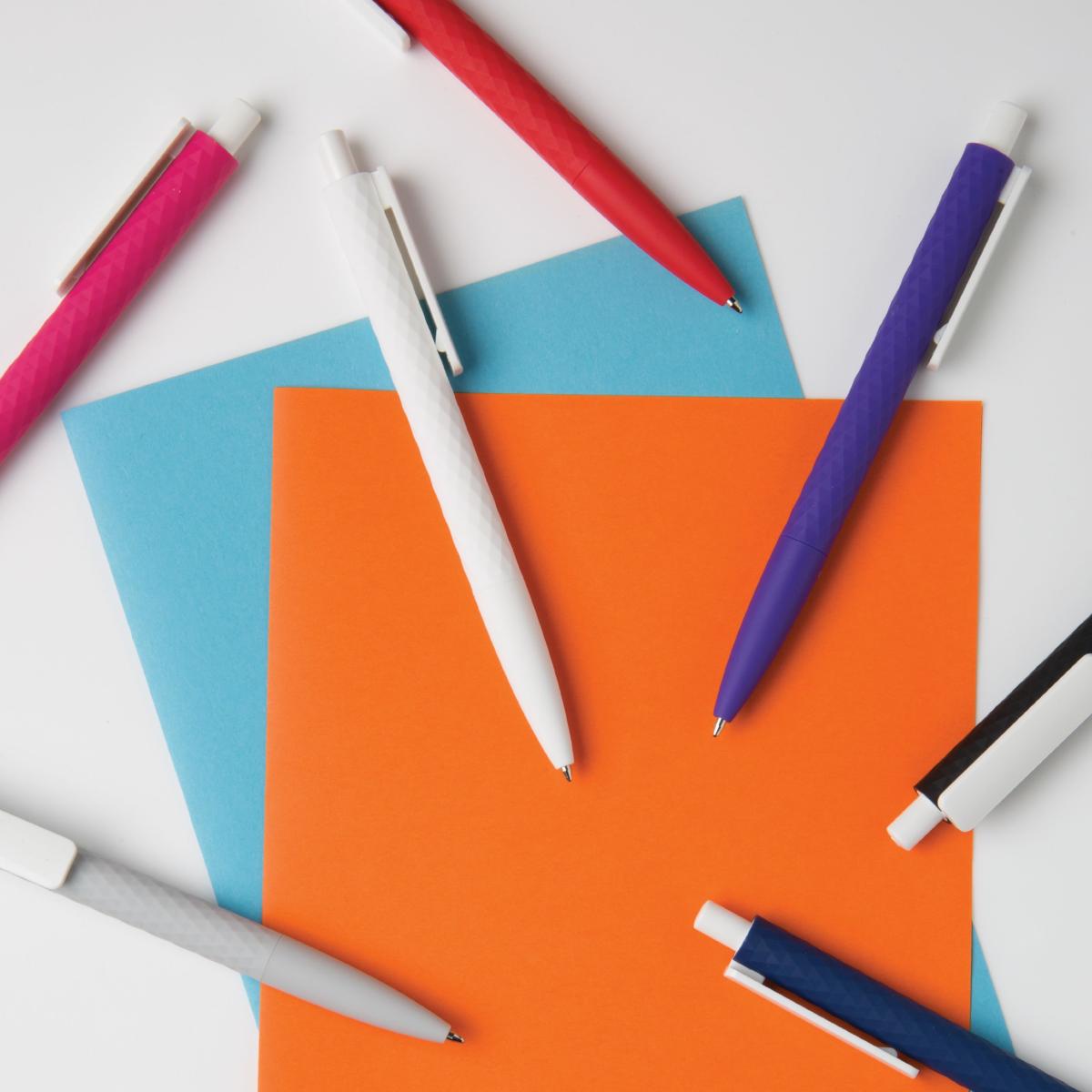 Stylo à bille rétractable en plastique avec finition losange texturé et attributs blanc. Nouvelle version avec finition gomme pour un confort d’écriture supplémentaire. Encre bleue Dokumental® de fabrication allemande pour +/- 1200m d’écriture et bille en carbure de tungstène assurant une écriture régulière.
