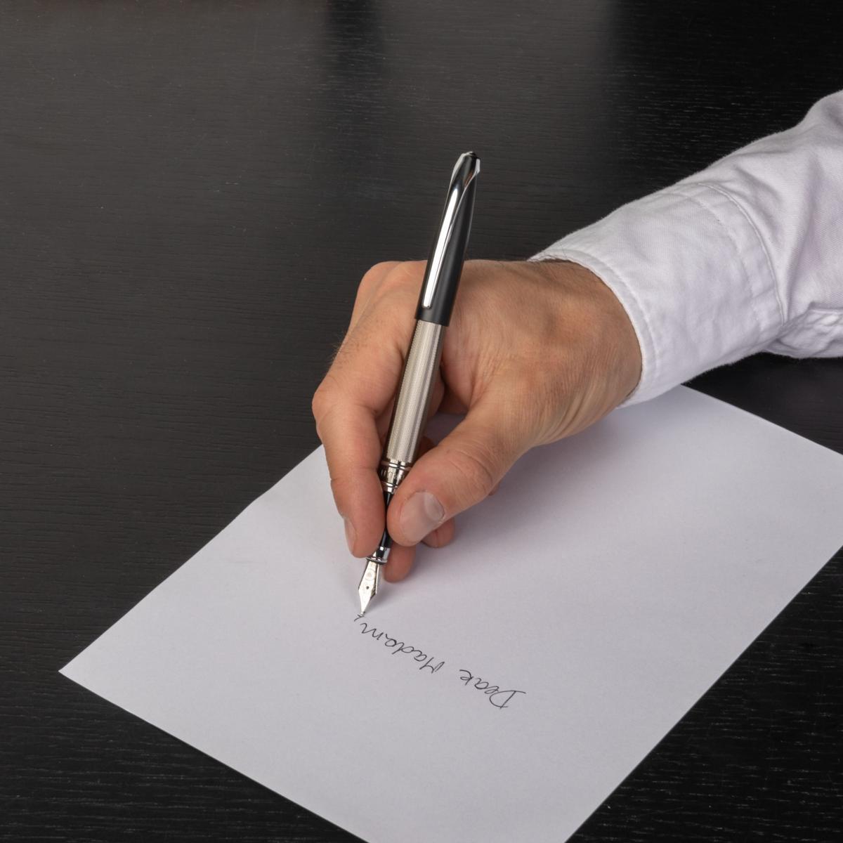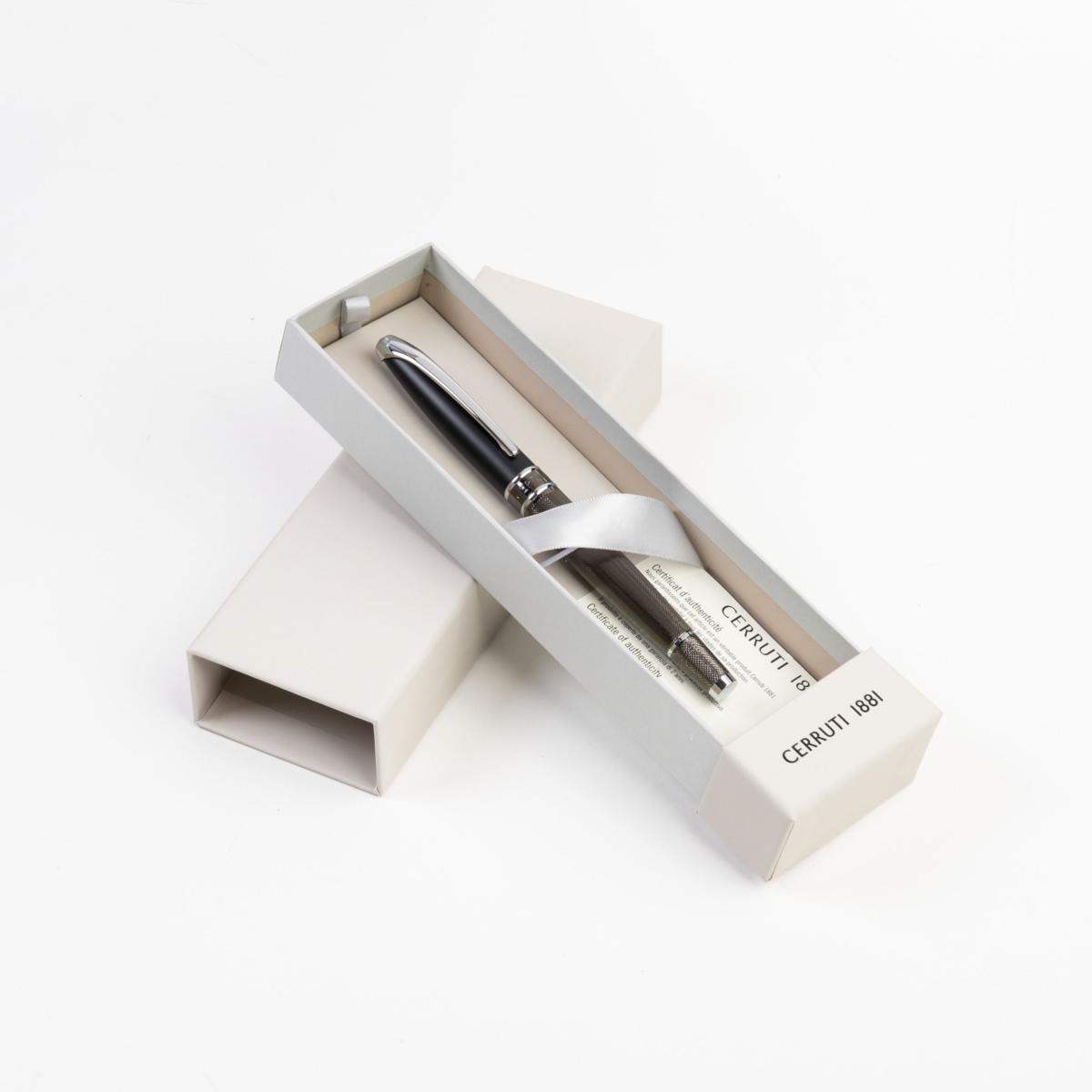 Stylo plume de la marque Cerruti 1881. Silhouette emblématique. Finitions laquées noires mates. Corps gravé en forme de diamant. Moderne et élégant