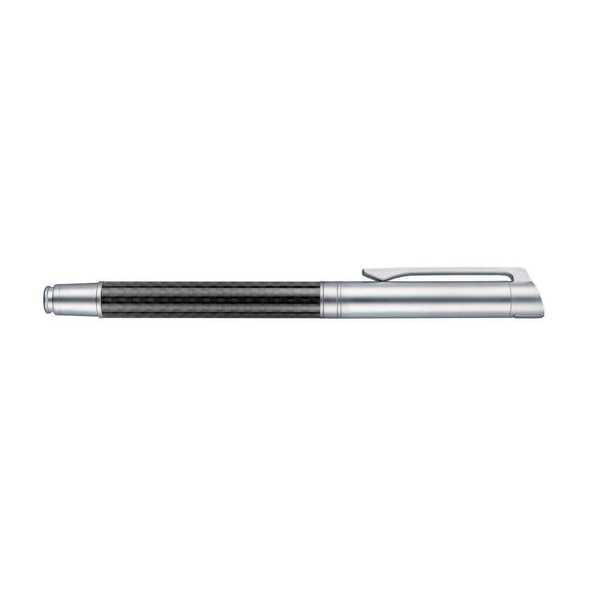 Stylo à plume avec gravure sur le capuchon. Métal combiné avec du carbone. Plume en acier à pointe iridium. Quantité minimale 25 PC - Unité de vente 5 PC.