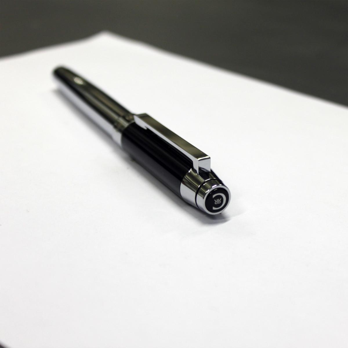 Base laiton. Finition chrome. Capuchon laqué noir. Poids et équilibre exceptionnel. Distingué et sobre.
