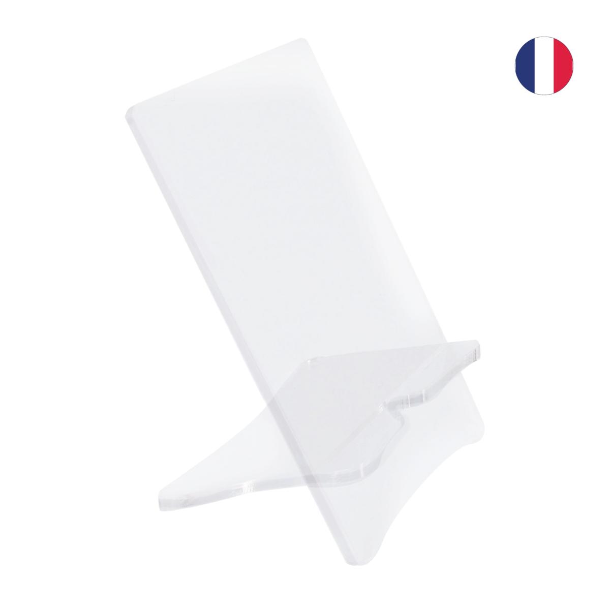 Support pour téléphone en PMMA 95% recyclé transparent. Epaisseur 5 mm. Dimensions : 8,5 x 13,3 cm.