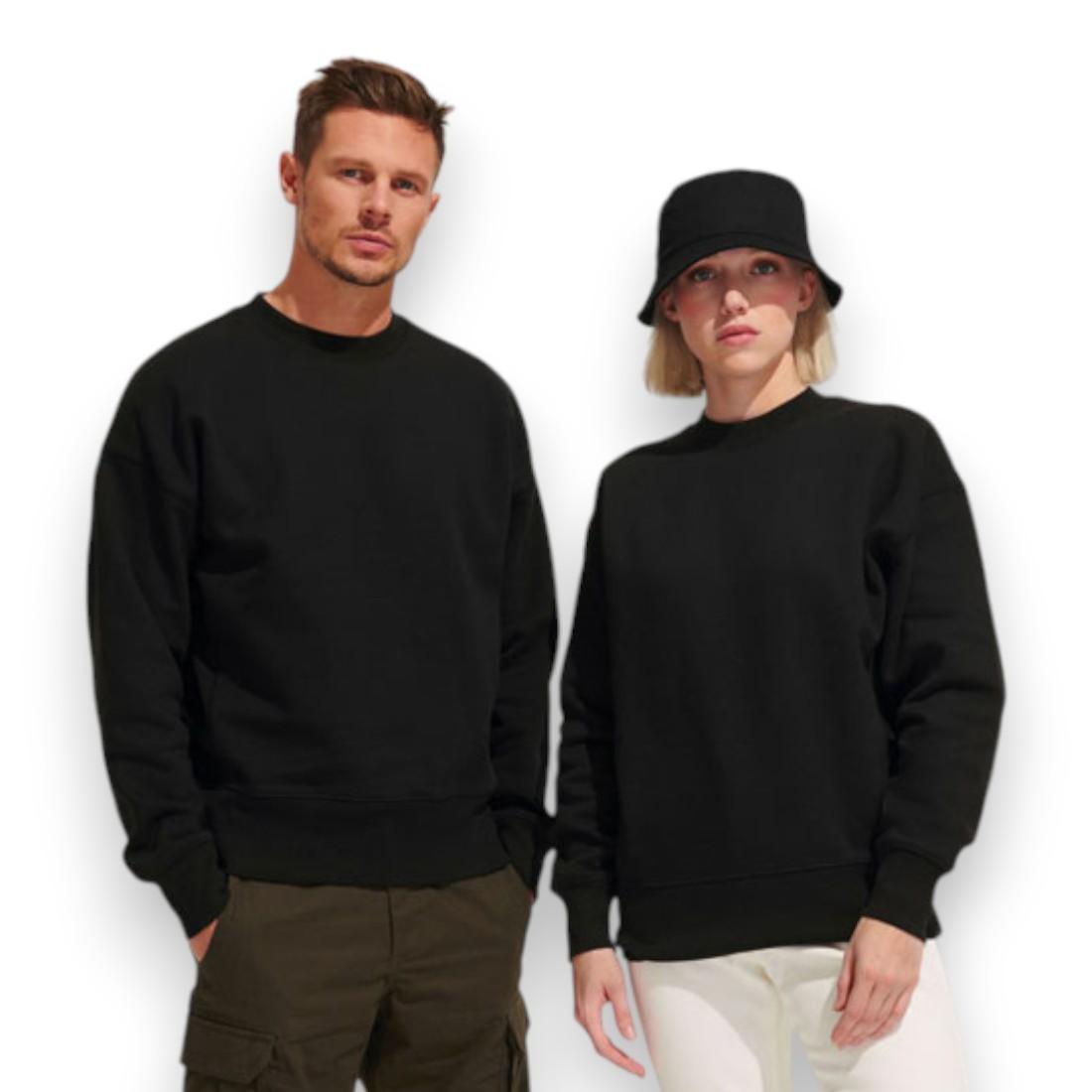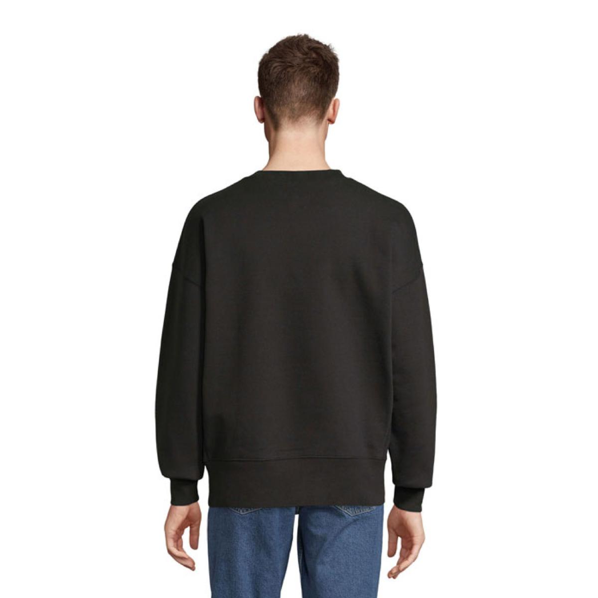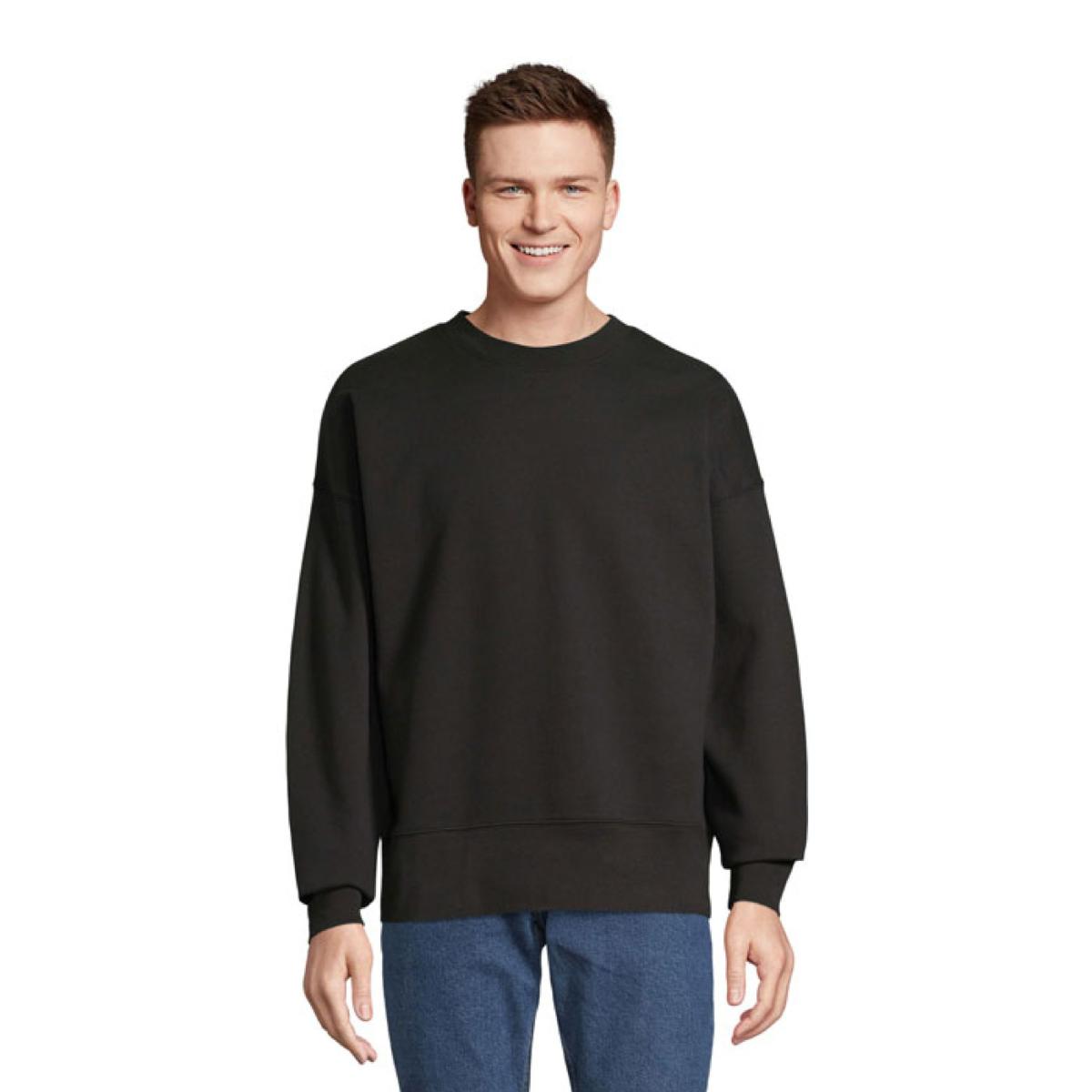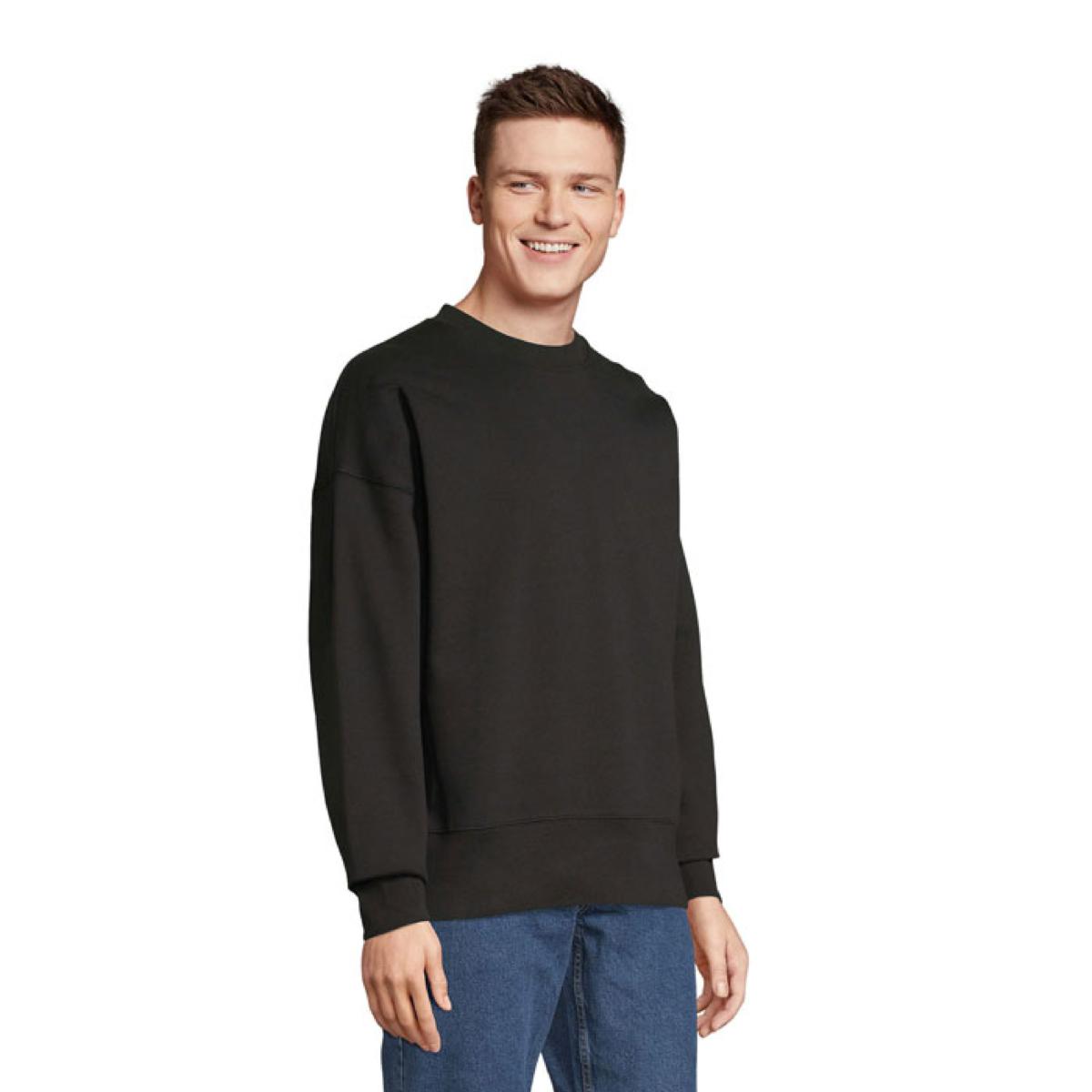 Sweat à col rond unisexe. Coupe oversize. Coupé cousu. Manche montée avec épaule tombante. Col, poignets et bas du corps avec bord-côte. Empiècements latéraux en bord-côte. Bande de propreté intérieur col.