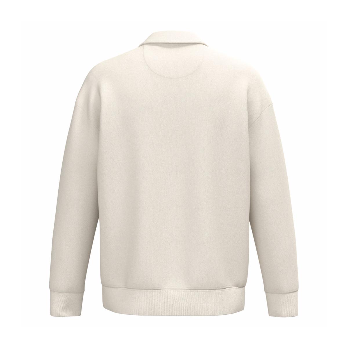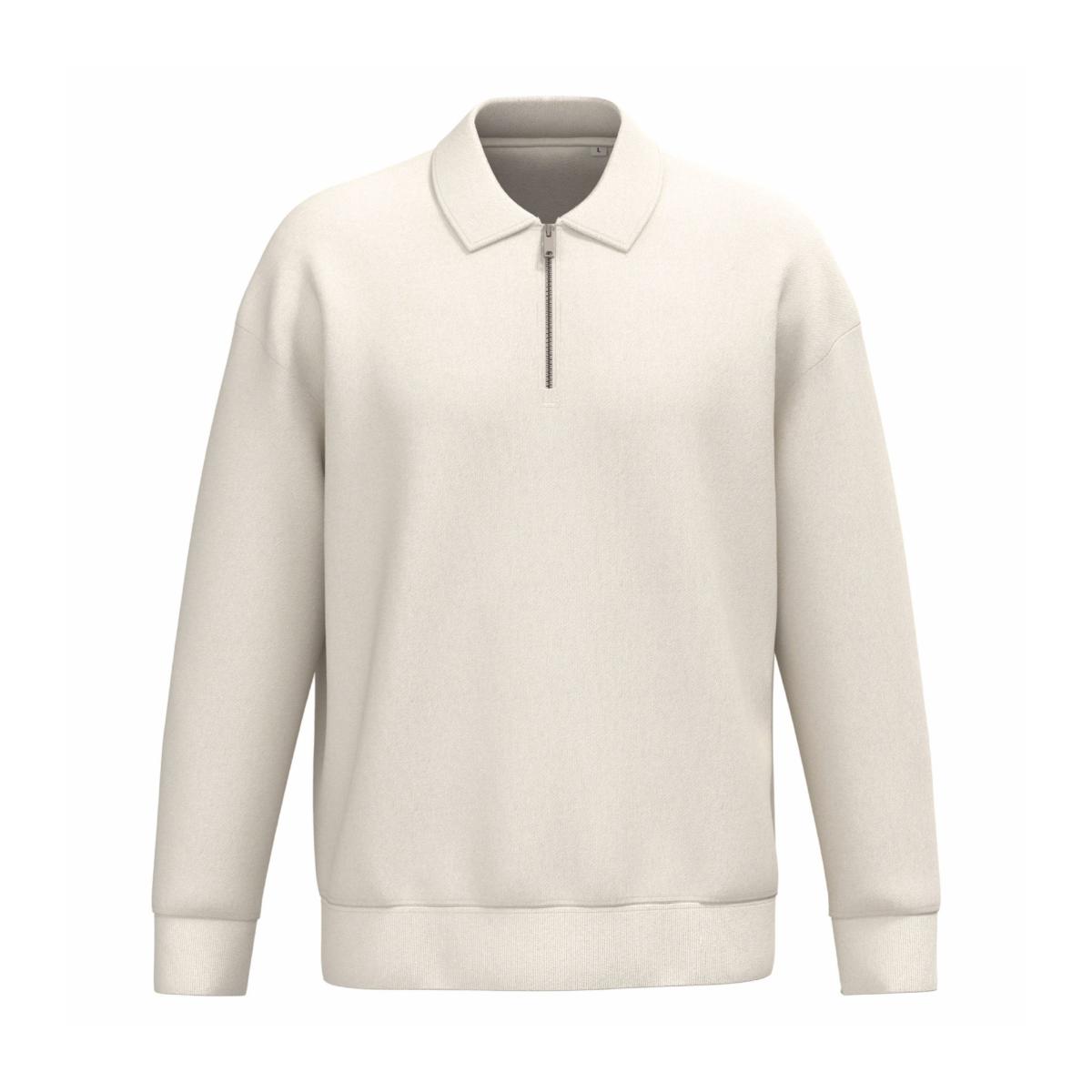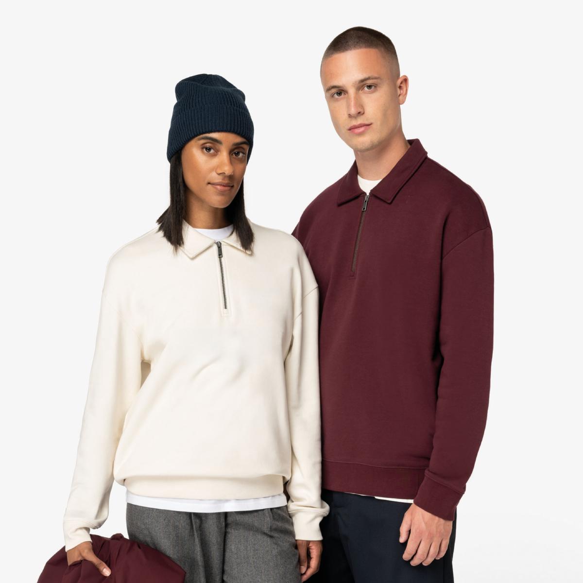 Sweat-shirt écoresponsable avec col zippé. Epaules tombantes. Coupe unisexe. Molleton gratté 3 fils LSF (Low Shrinkage Fleece : molleton pré-rétréci). Col polo surpiqué avec ouverture quart de zip en métal recyclé. Bord côte 1 x 1 bas de manches et bas de vêtement. Finition intérieur col avec bande de propreté en jersey ton sur ton. Demi-lune au dos.
