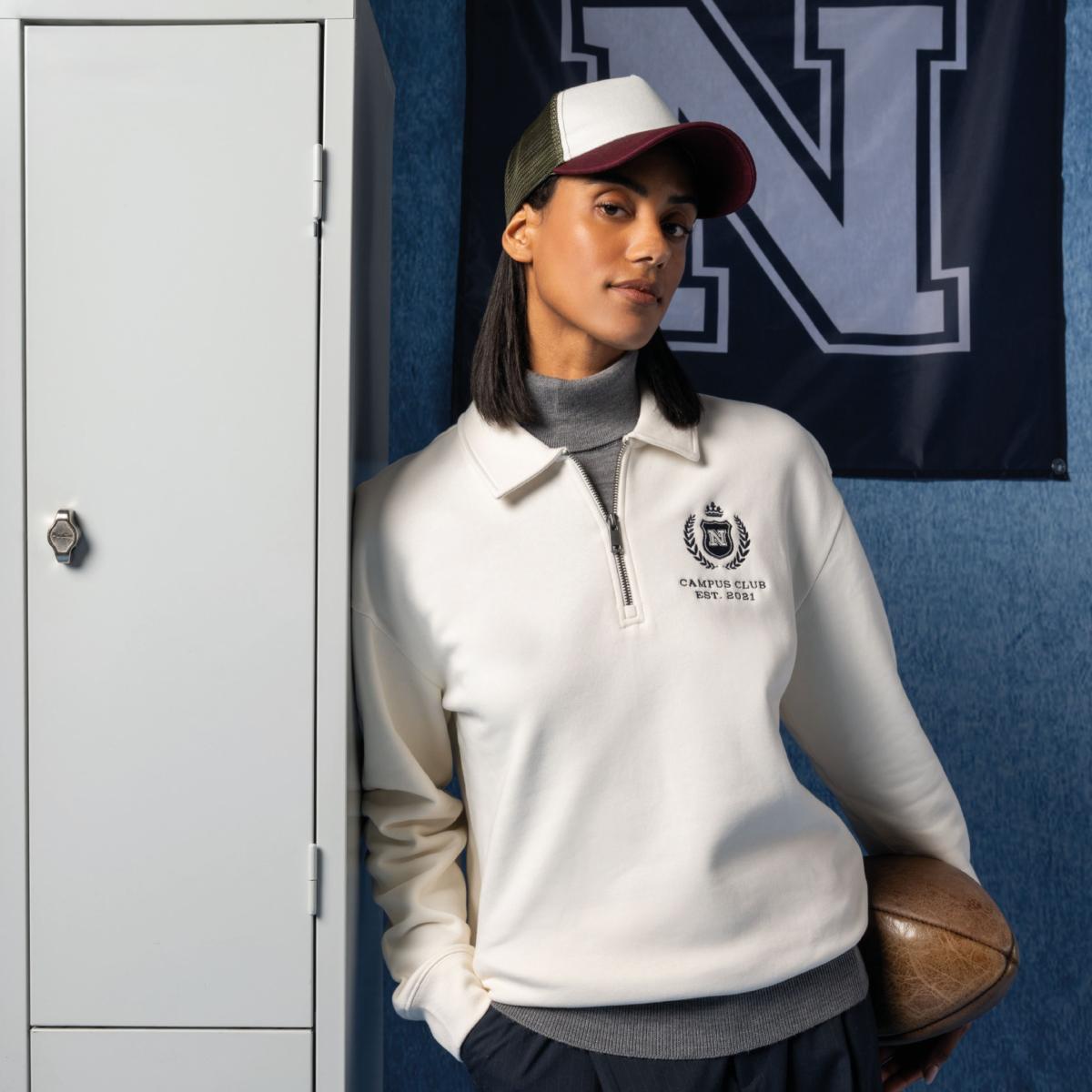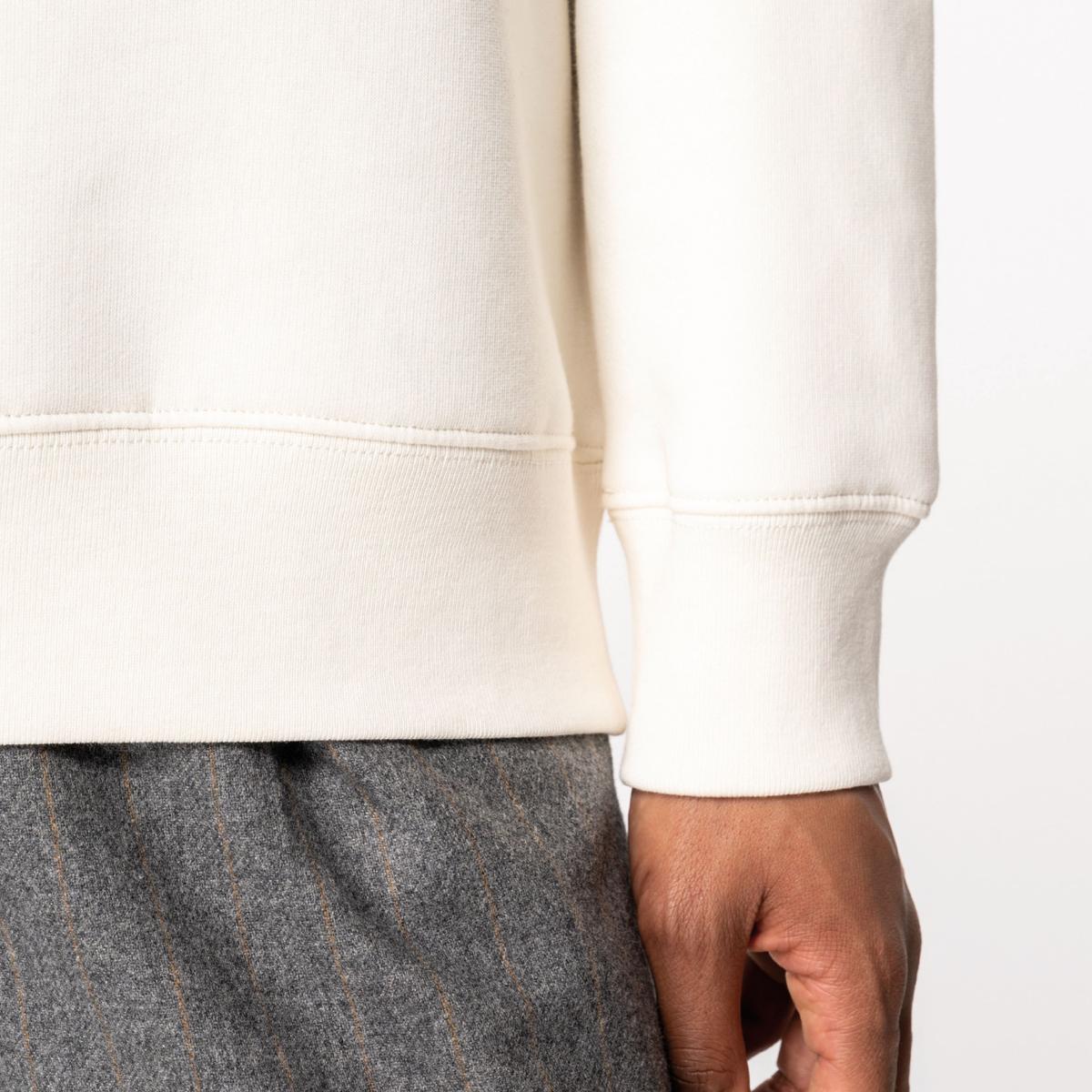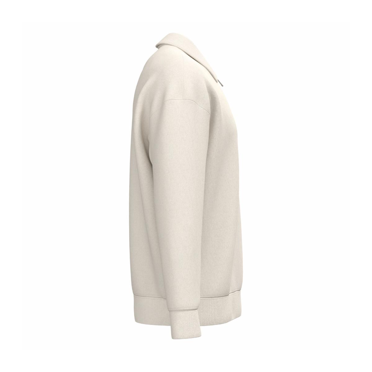 Sweat-shirt écoresponsable avec col zippé. Epaules tombantes. Coupe unisexe. Molleton gratté 3 fils LSF (Low Shrinkage Fleece : molleton pré-rétréci). Col polo surpiqué avec ouverture quart de zip en métal recyclé. Bord côte 1 x 1 bas de manches et bas de vêtement. Finition intérieur col avec bande de propreté en jersey ton sur ton. Demi-lune au dos.
