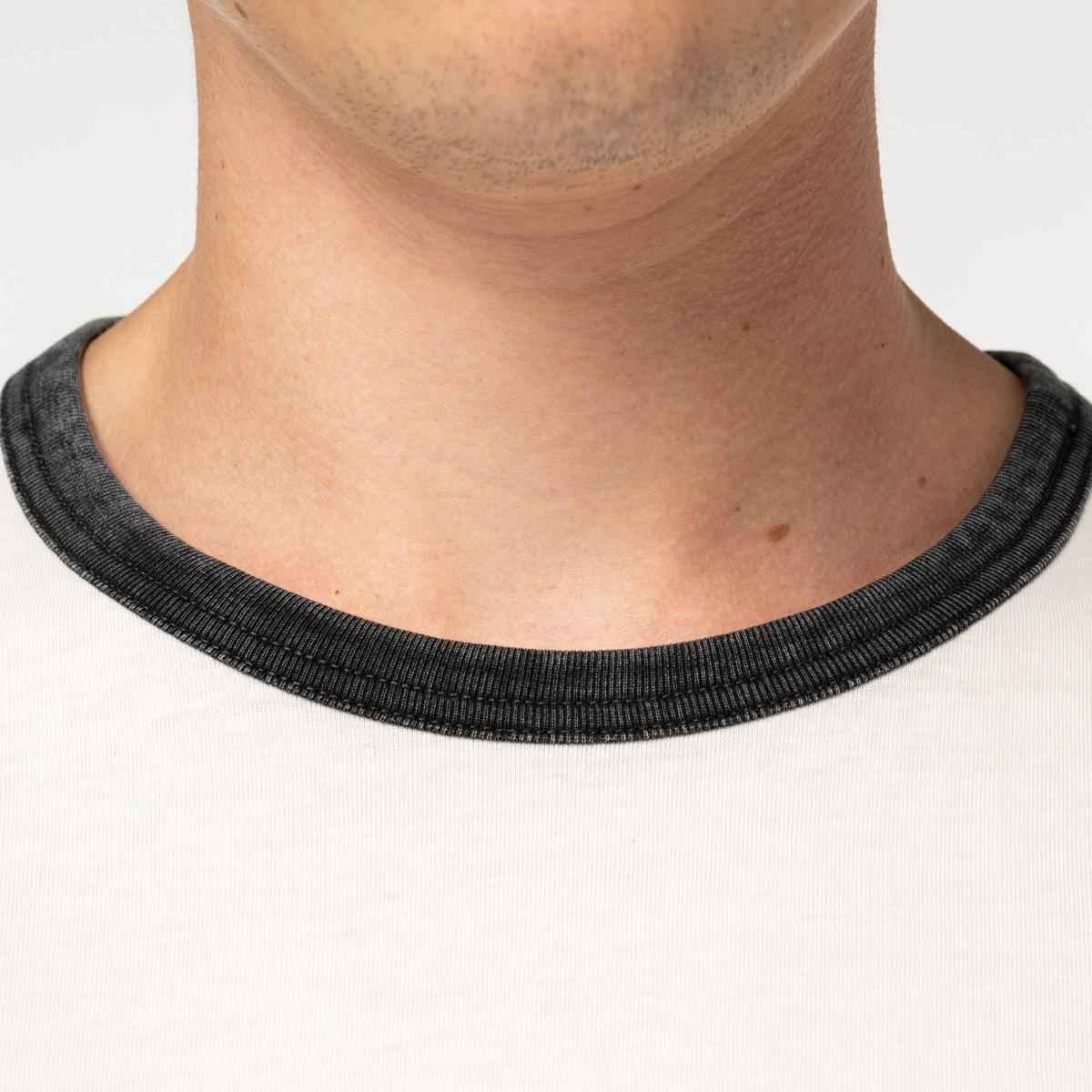 T-shirt à bords contrastés, effet délavé en coton biologique, pour homme. Coton peigné. Coupe droite. Coutures latérales. Col et bas de manches contrastés en colletage bord côte 1 x 1. Effet délavé avec double surpiqûres. Renfort épaule.