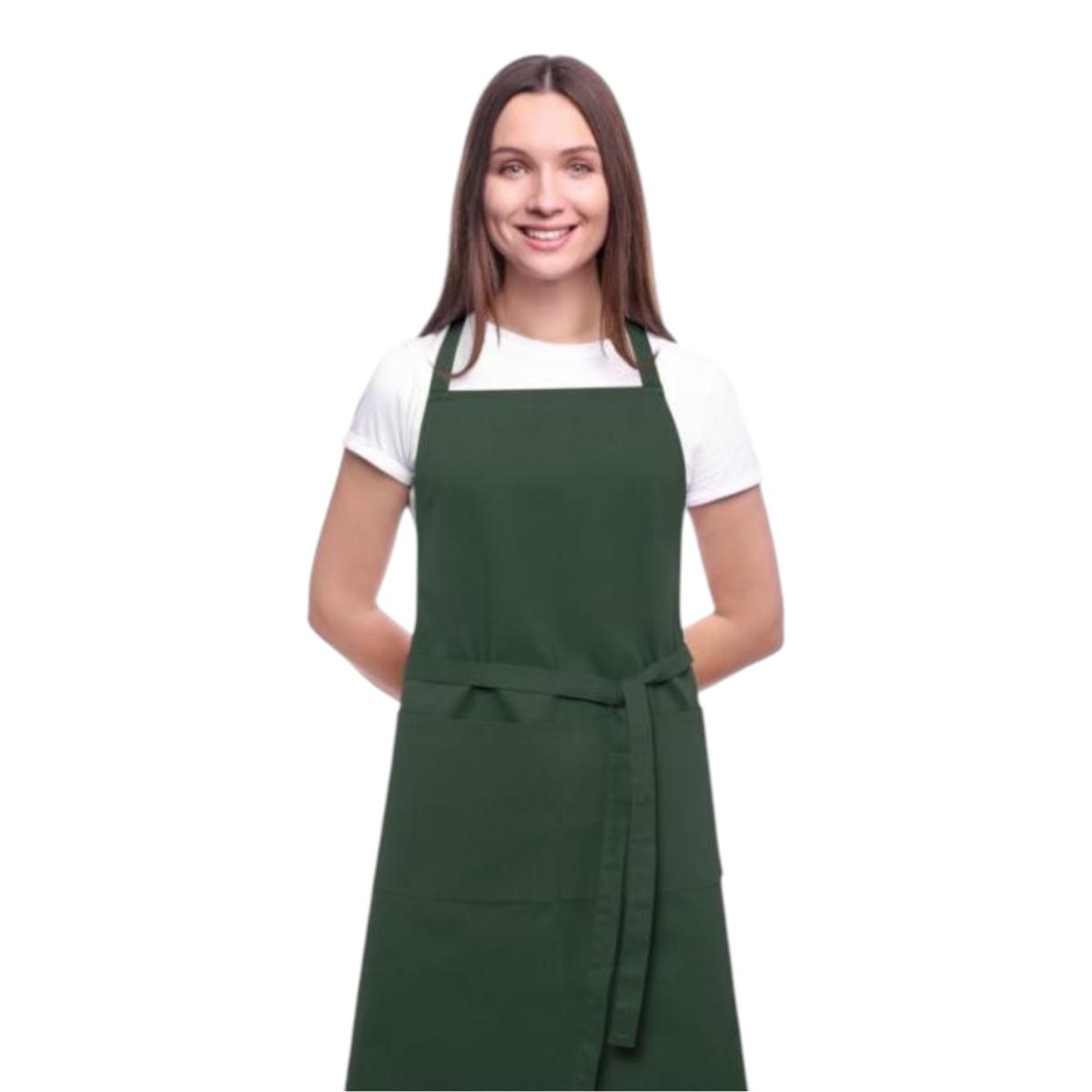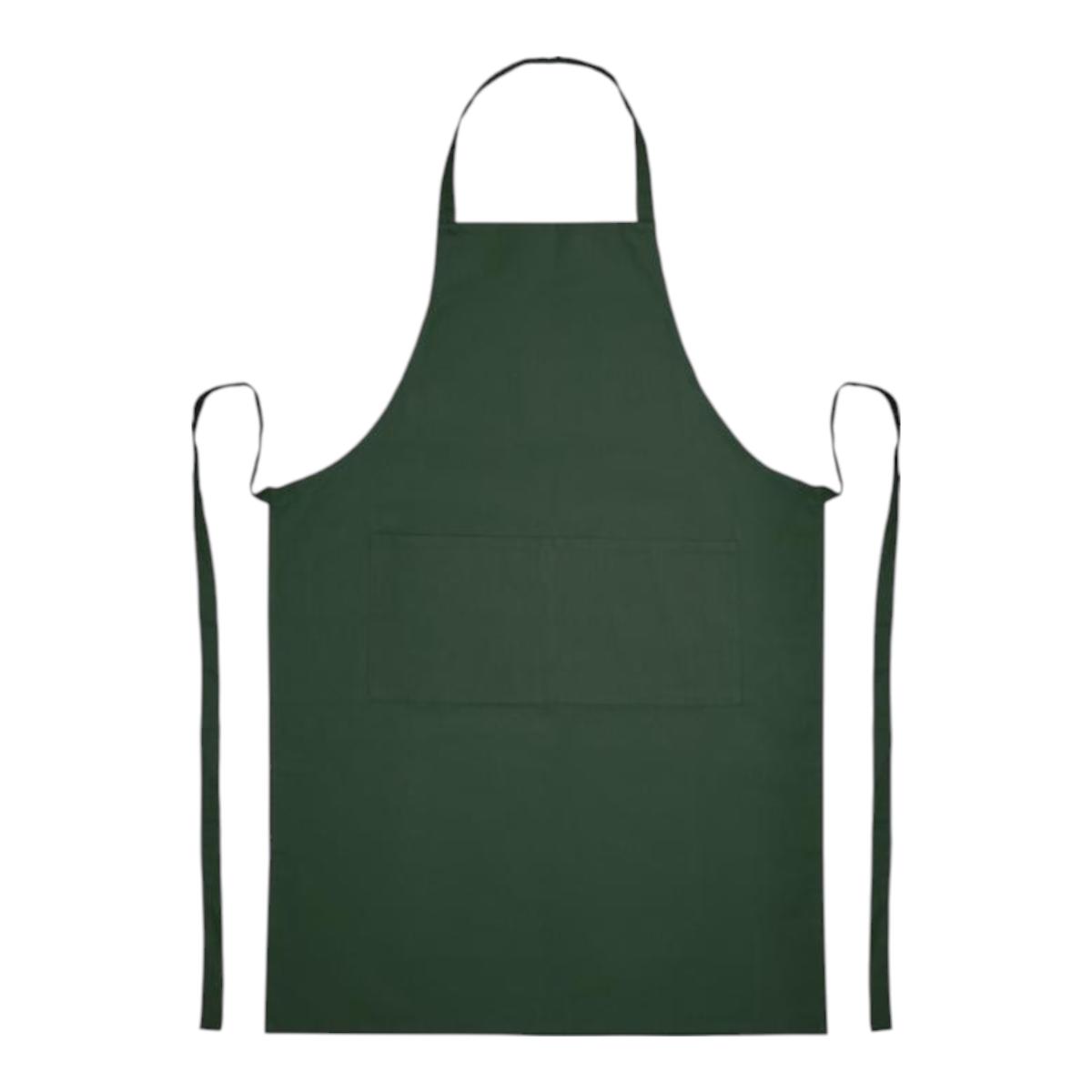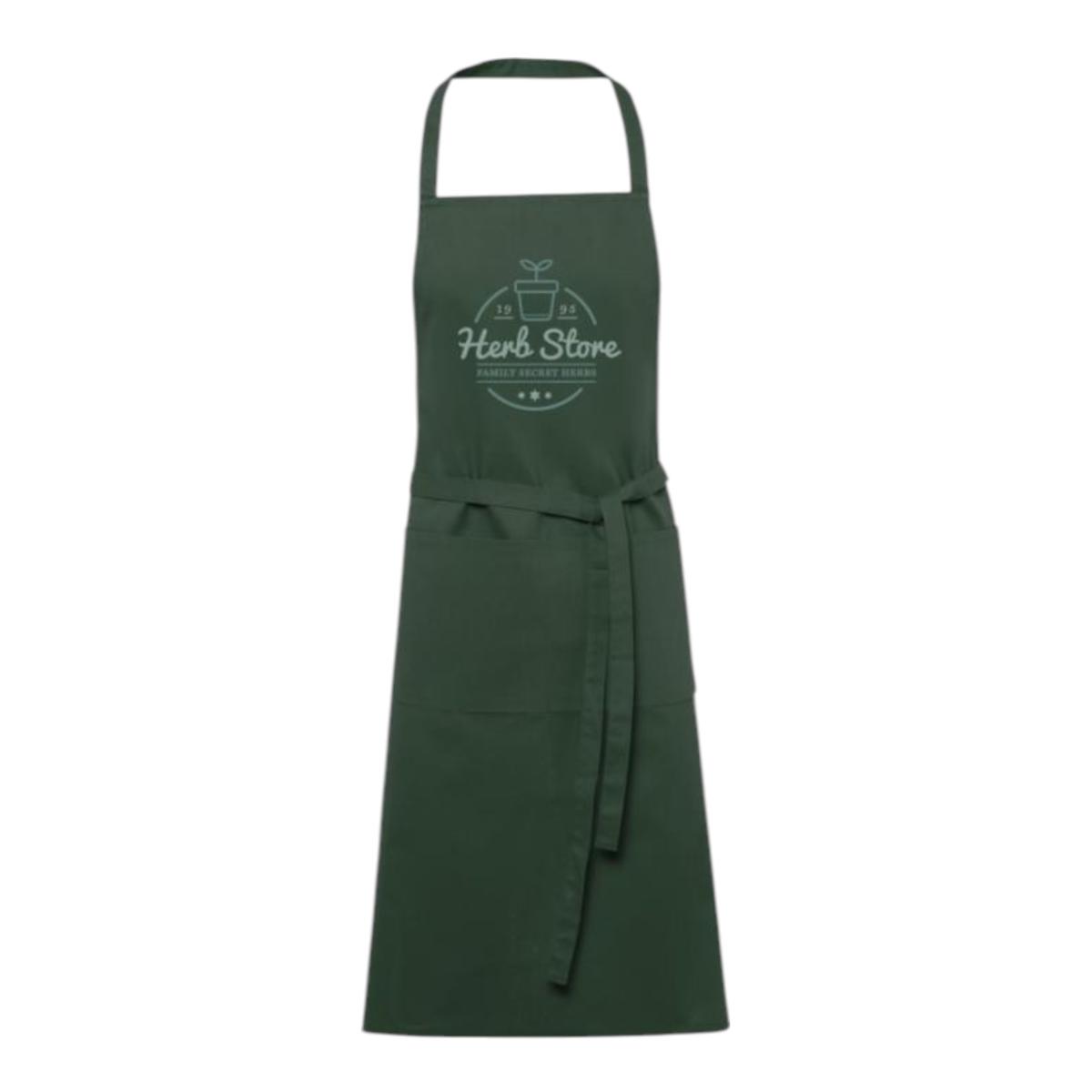 Tablier durable en coton biologique. Deux poches adjacentes d'une taille combinée de 45 x 20 cm, et une fermeture à cordon d'un mètre. Longueur de la lanière de cou : 55 cm.