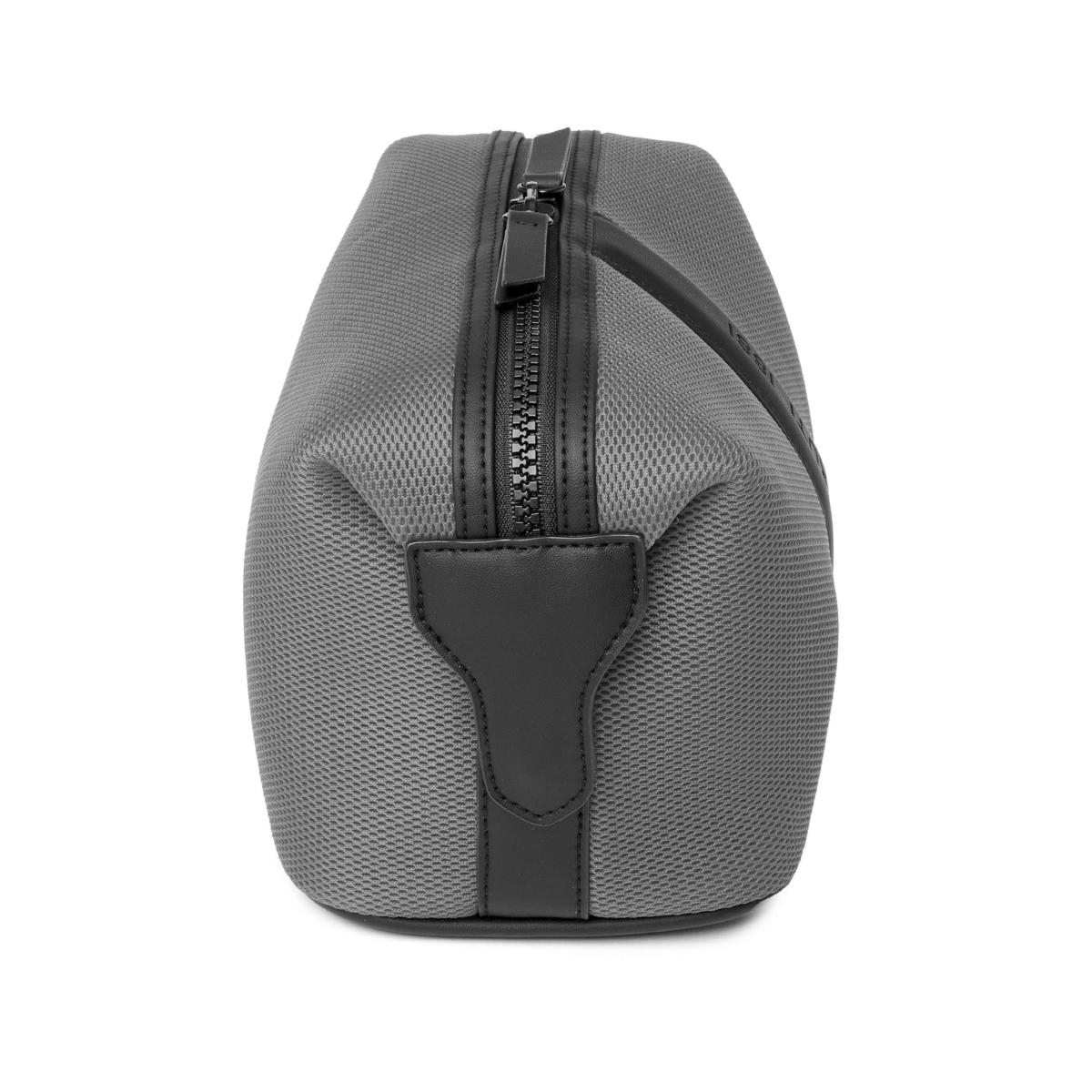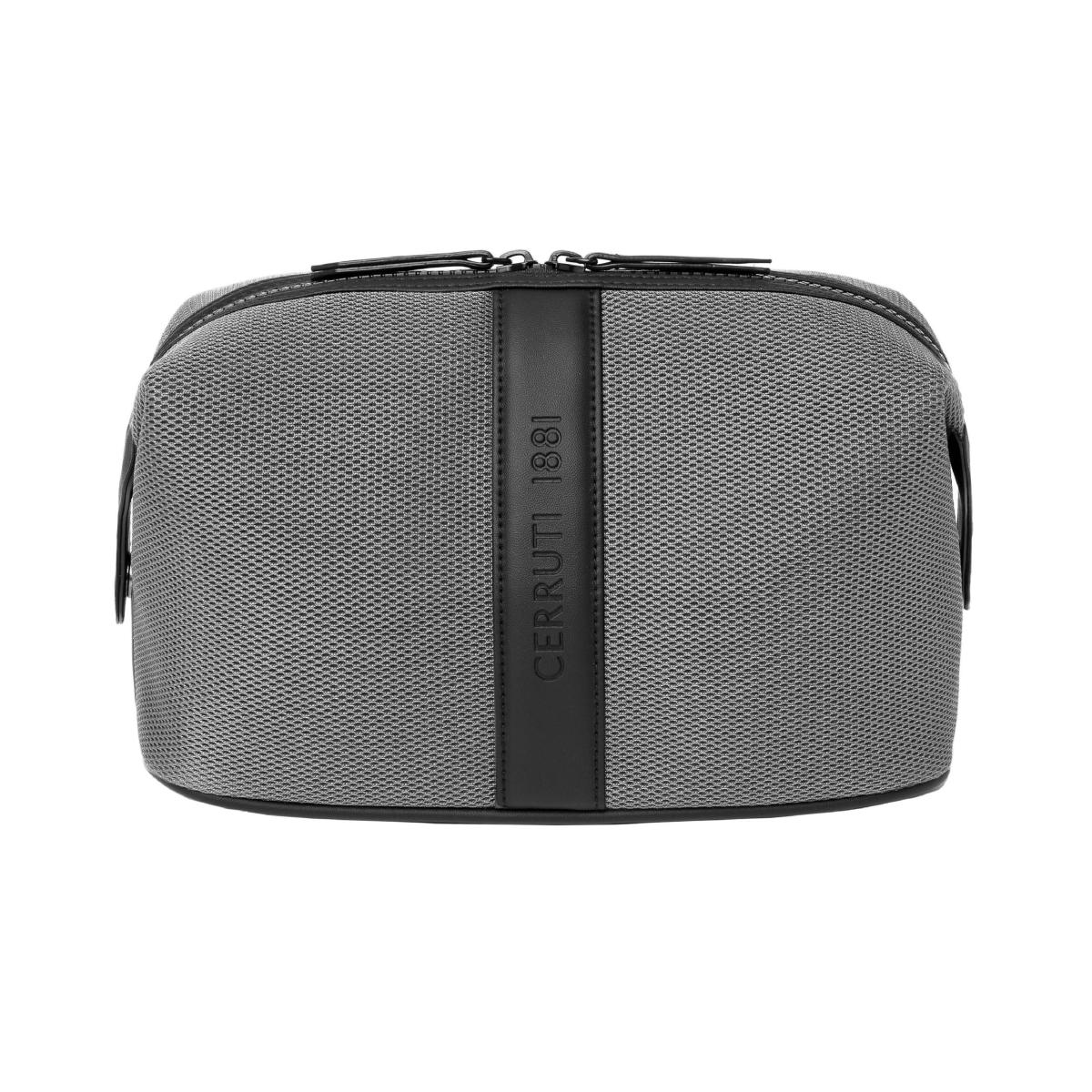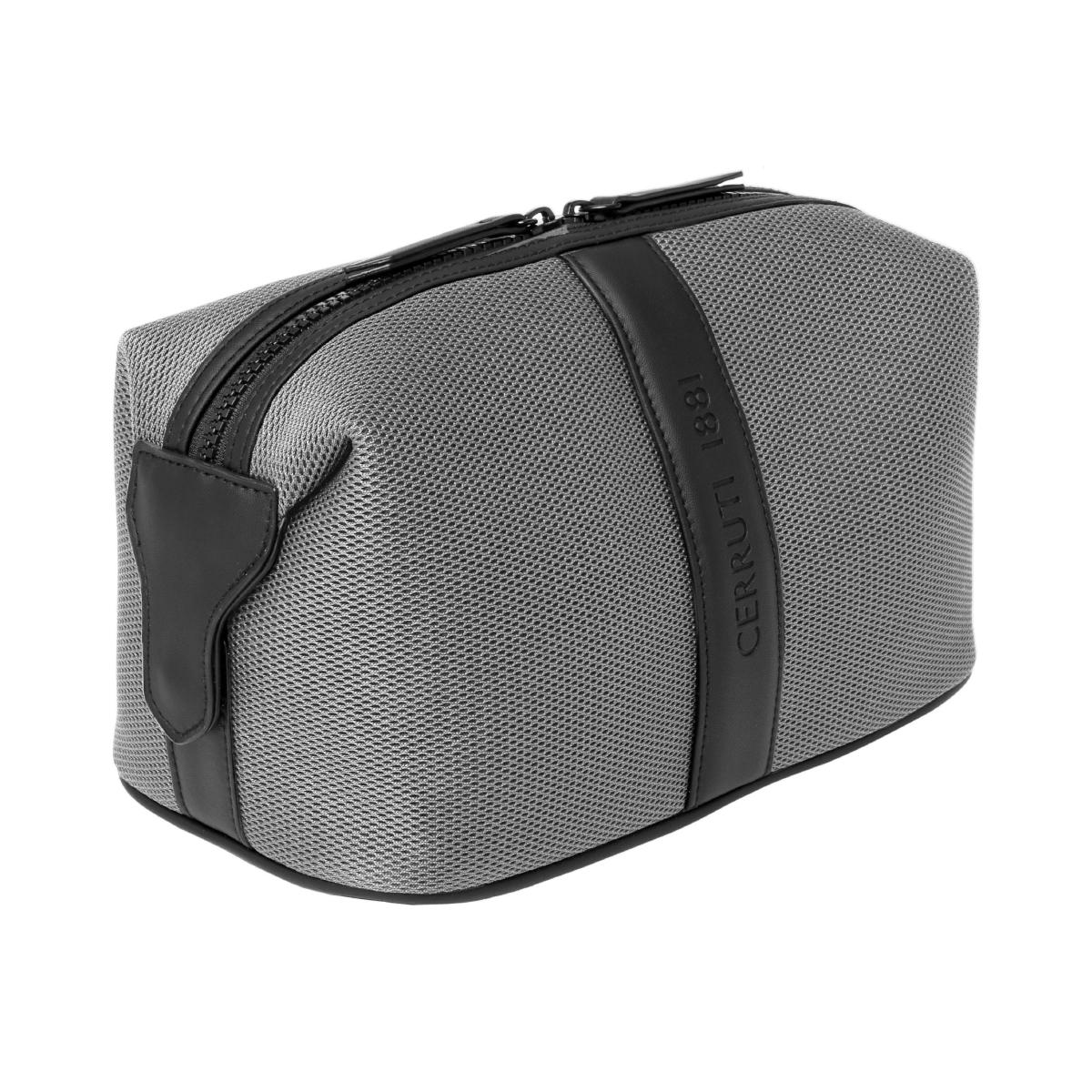 Trousse de toilette, de la marque Cerruti 1881. Tissu en maille de pointe, inspiré des vêtements de sport. Logo signature surdimensionné et embossé. Fermeture à glissière surdimensionnée. Légère et souple. Moderne et fonctionnelle.